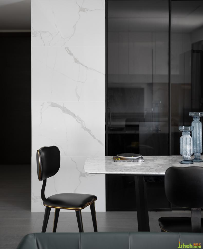 In order to brighten the kitchen during the day, the designer deliberately chose a glass door. The light flows in from the balcony of the living room, lighting up the space and people's mood. The transparent partition door not only prevents cooking fumes from invading other spaces, and facilitates daily cleaning, but also ensures that when working in the kitchen, you can see friends and family members who are talking and playing in the dining room or living room. While completing the visual natural transition and continuity, it enriches the interaction between people and space.