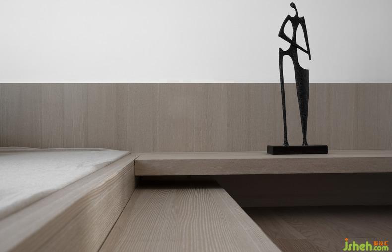 臥床的兩側(cè),一個黑色圓形木質(zhì)床頭桌,一把可以看得出使用年歲的吉他,室內(nèi)設(shè)計師便是所有的裝飾。書與音樂自帶著靜心的力量,創(chuàng)造著絕對放松的休憩空間,賦予生活柔和的深度與溫度。