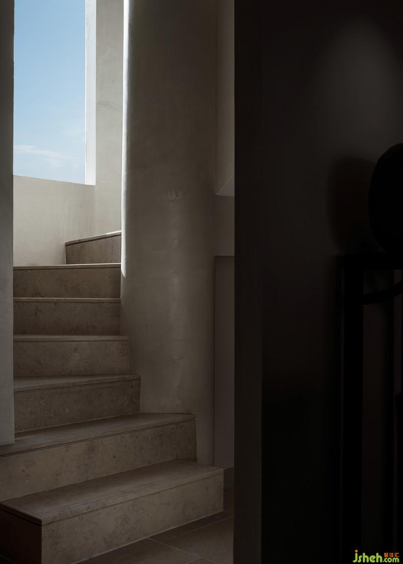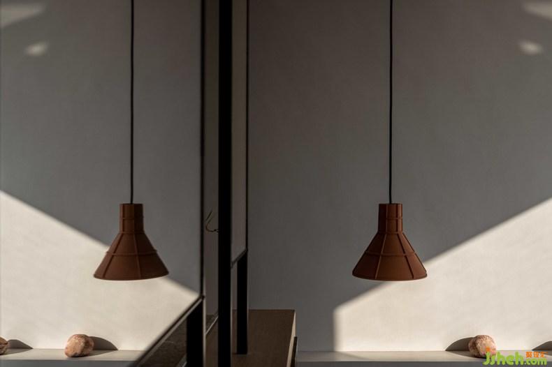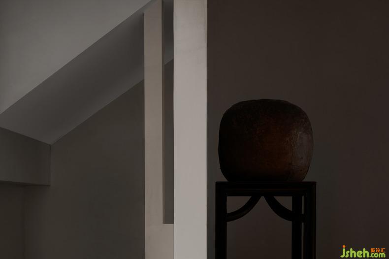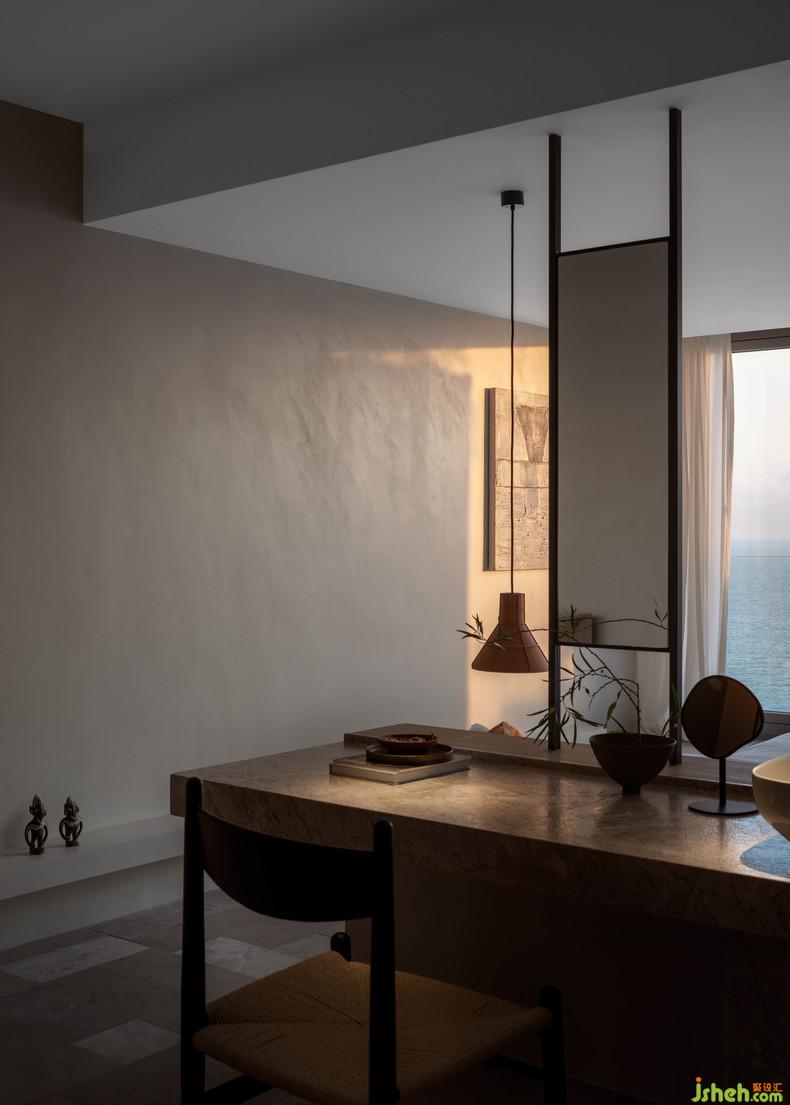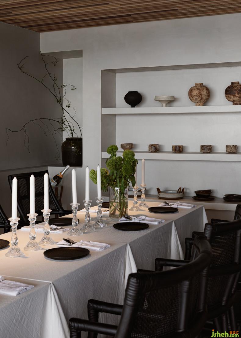 餐廳位于接待區(qū)下方。承接而下的樓梯小徑,帶著點古堡神秘的味道,將人引入一片拙樸而典雅的氛圍。酒店設(shè)計空間以留白為形式主題,通過陶器、木飾天花板和大理石桌的設(shè)置,保留整體的干凈與簡單。一器一物,一茶一飯,生活的動人,往往就在于不著痕跡卻又恰到好處的細節(jié)之中。