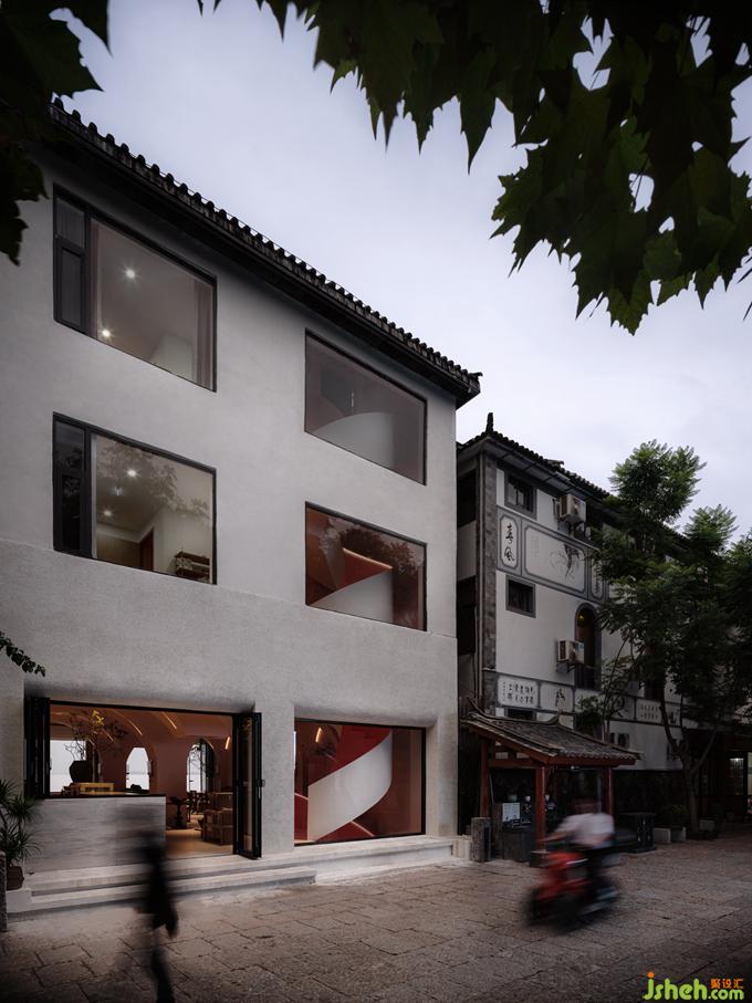 保留了白族建筑的飛檐翹角,蜚聲將整個(gè)建筑的外立面進(jìn)行了改造。整棟樓的外墻,由向內(nèi)的磚瓦的封閉,改為向外的玻璃的通透。在保留建筑形體與空間結(jié)構(gòu)的同時(shí),使得人的視野得以貫穿整個(gè)空間,達(dá)成室外室內(nèi)再到室外的三重對話與互動(dòng)。
