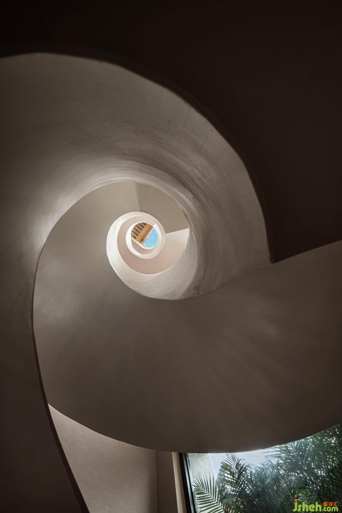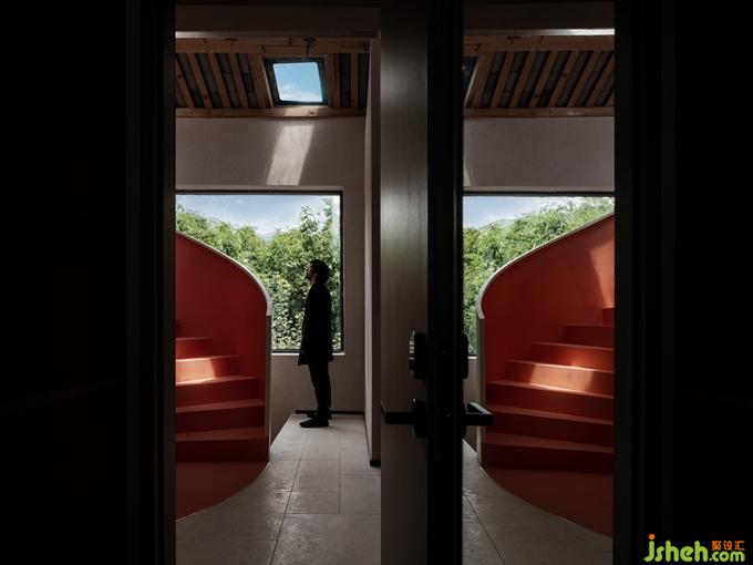在光影的交織中,樓梯不斷地旋轉(zhuǎn)而上,好似空間的媒介一般,將功能完全不同的各個(gè)樓層串聯(lián)為整體。就像一棵從民宿里生長(zhǎng)出來的樹一樣,陪伴著人群的流動(dòng),默默無言卻又充滿生命力,營(yíng)造出不同于任何空間的獨(dú)特場(chǎng)域。