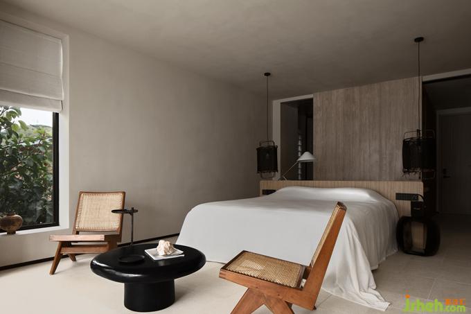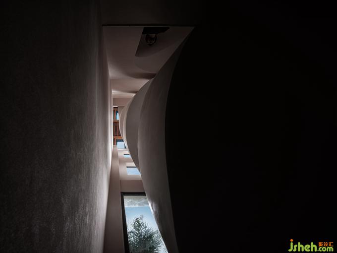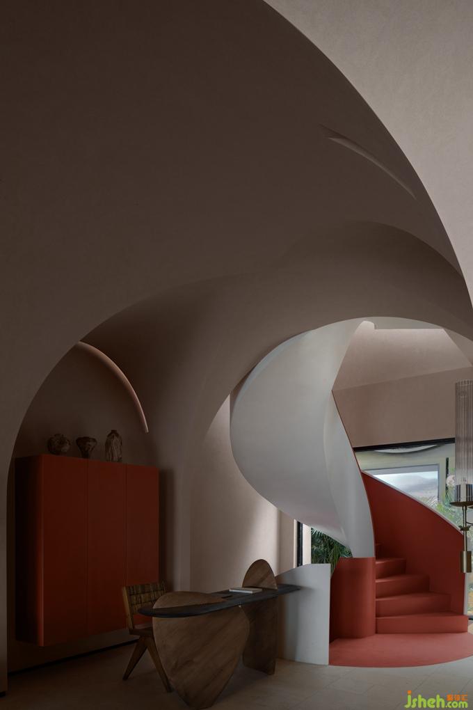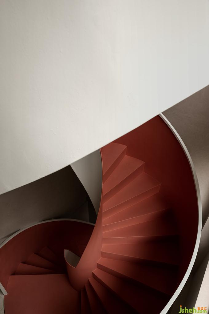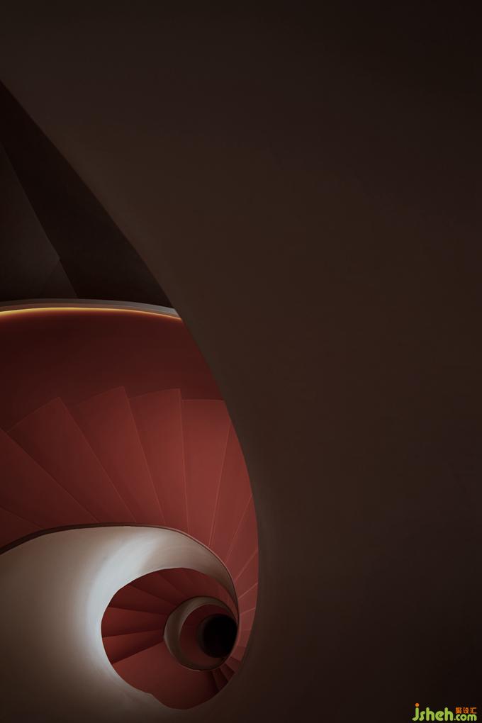 不同于外在的白色主色調(diào),樓梯內(nèi)裹的一抹朱色,為空間注入一分清新的亮度,帶來了年輕感與活力。卻又因添加的那一點(diǎn)樺色的沉淀,而多了一分克制的內(nèi)斂,將整個(gè)顏色的亮度下壓,達(dá)成了空間色系的平衡。酒店設(shè)計(jì)