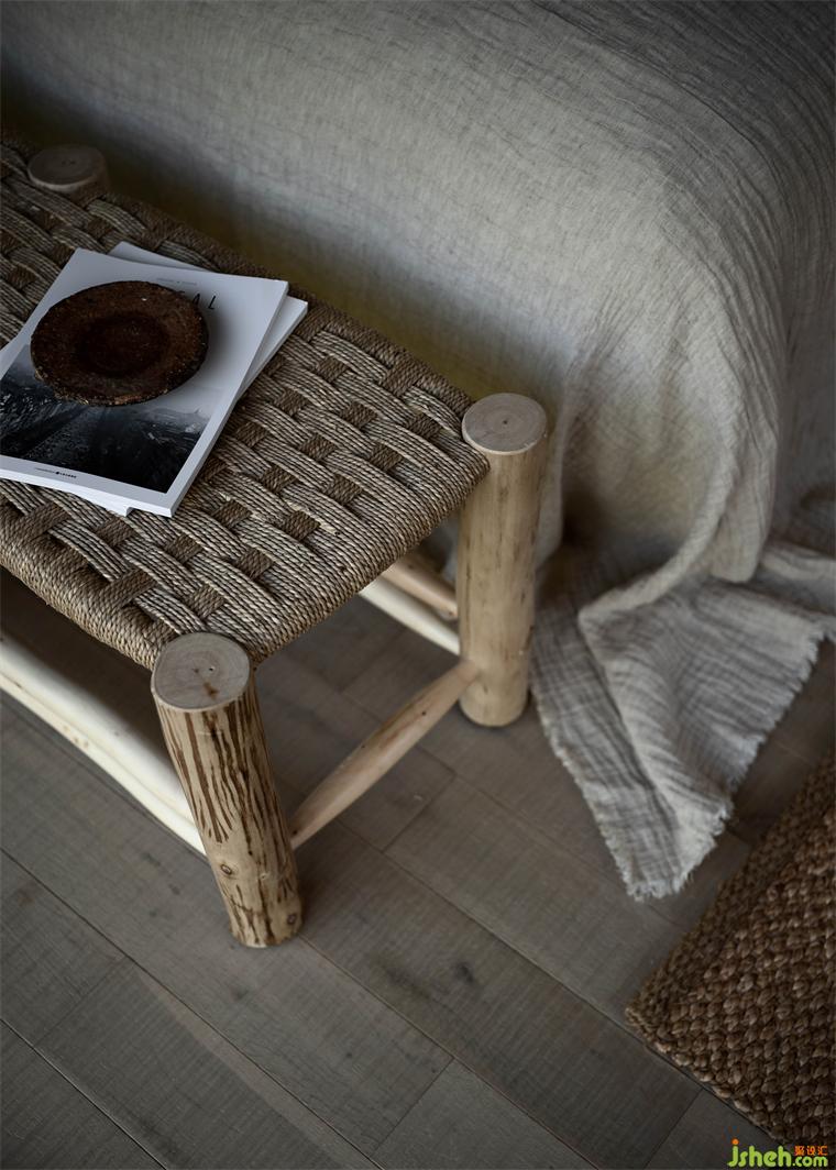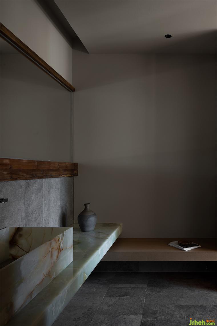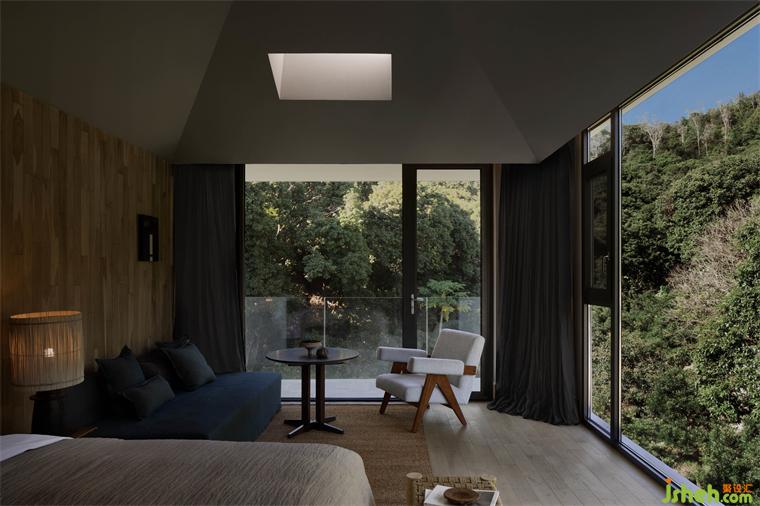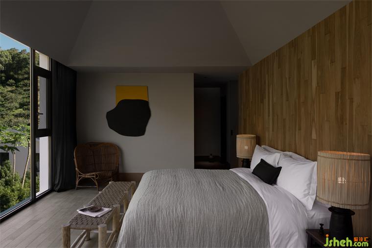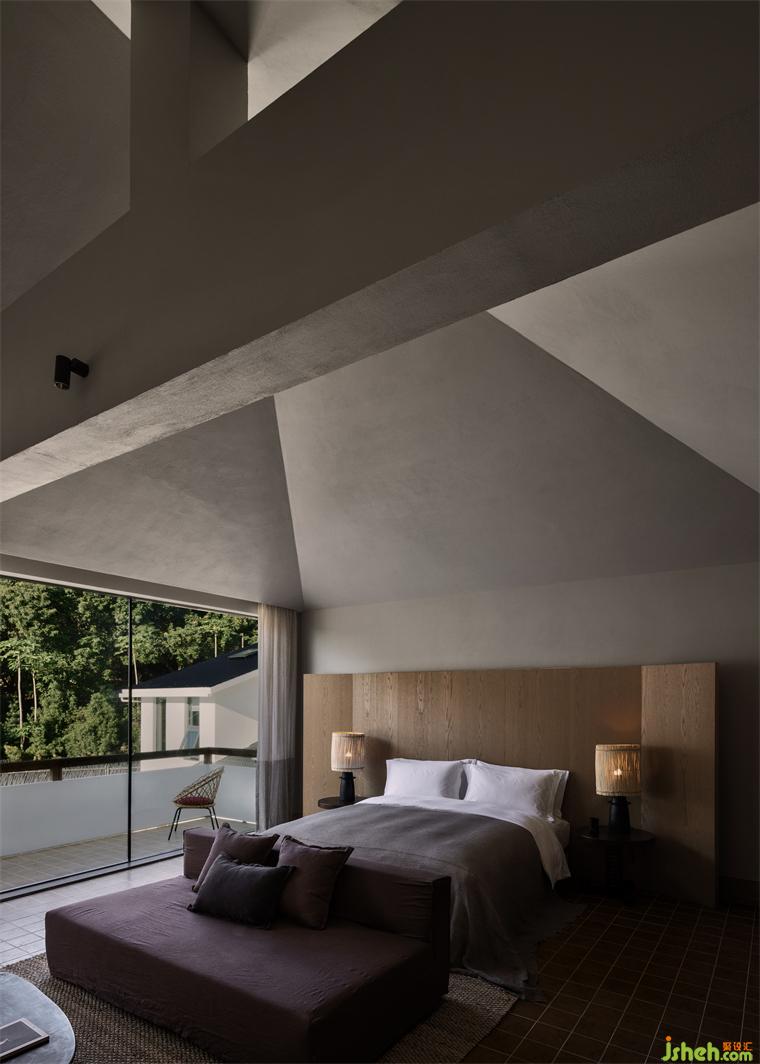 室內(nèi)規(guī)劃隨著空間的轉(zhuǎn)移,產(chǎn)生了動(dòng)態(tài)的變化。原本平鋪的天花在此處向上抬升,深圳民宿設(shè)計(jì)將柱體的原始形態(tài)自然袒露。穿插于線條之中,構(gòu)筑出不規(guī)則的幾何美感。