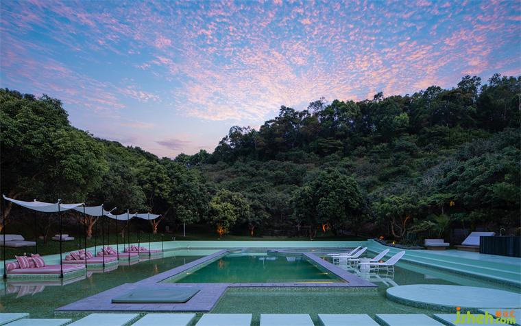 山間逸境的寬廣,深圳民宿設(shè)計給了設(shè)計師更多一點的任性。獨占一片空地,從滿山遍野的綠意,跳入另一片綠。方圓的拼接,打破泳池的固定形態(tài),將設(shè)計的趣味性外化。