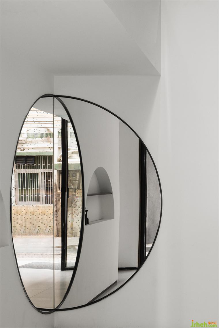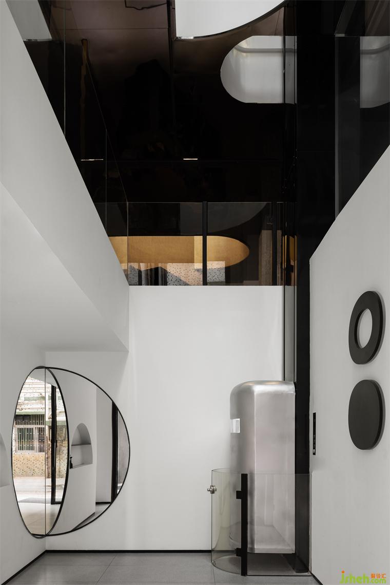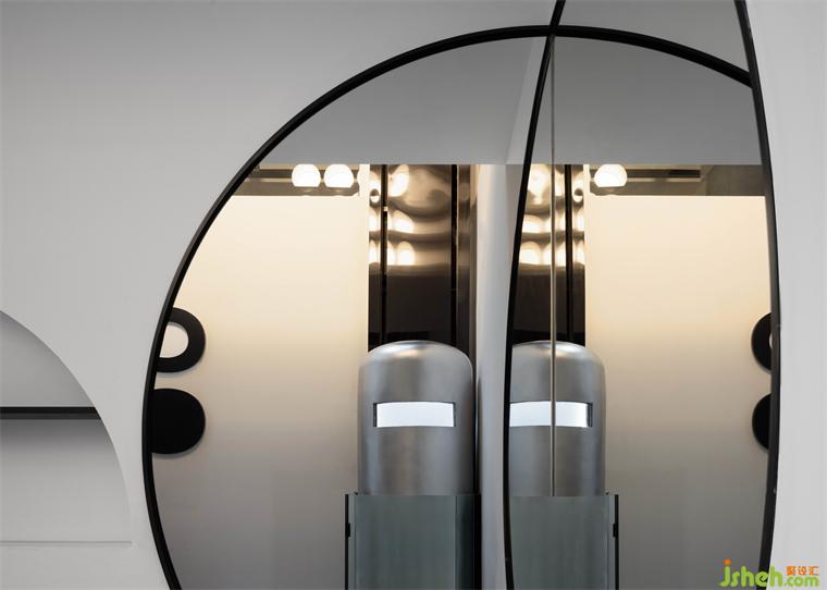 入門的一樓,是一處意識的轉(zhuǎn)換指引。90°垂直穿插的鏡面,創(chuàng)造著景致的循環(huán)相生。酒店設(shè)計市井之景的投射,行人之影的映照,穿插交錯間引發(fā)室內(nèi)室外、人與環(huán)境的多重互動,空間的陣列秩序于此獲得全新的排列方式。