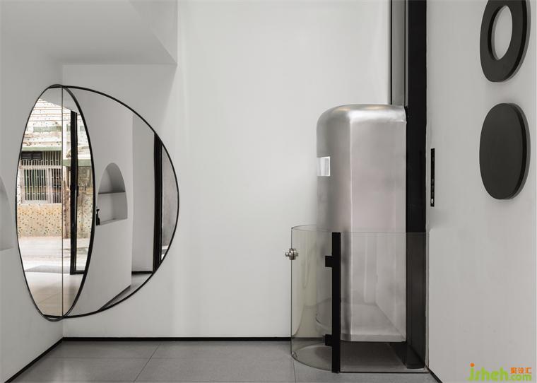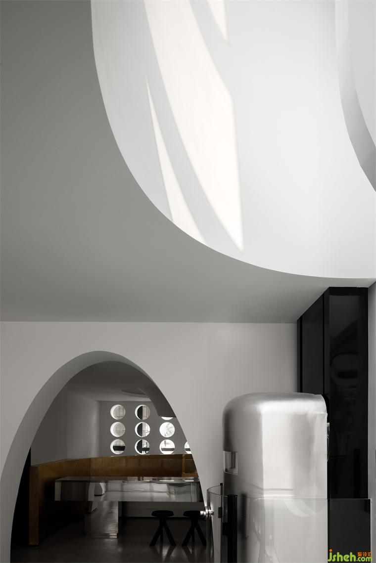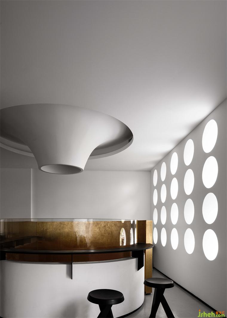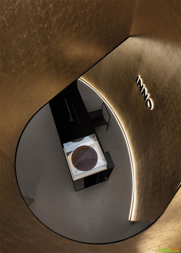 酒店設(shè)計(jì)將意識隨著金色向上流動(dòng),收聚于樓上咖啡廳頂端,空間聯(lián)系在上下互動(dòng)中再次增強(qiáng)。探照燈一般的排窗前后呼應(yīng),與天花處的未來之眼相互映射。在圓形的世界中探視、俯瞰,視覺的欺騙性將具象與虛擬折疊。