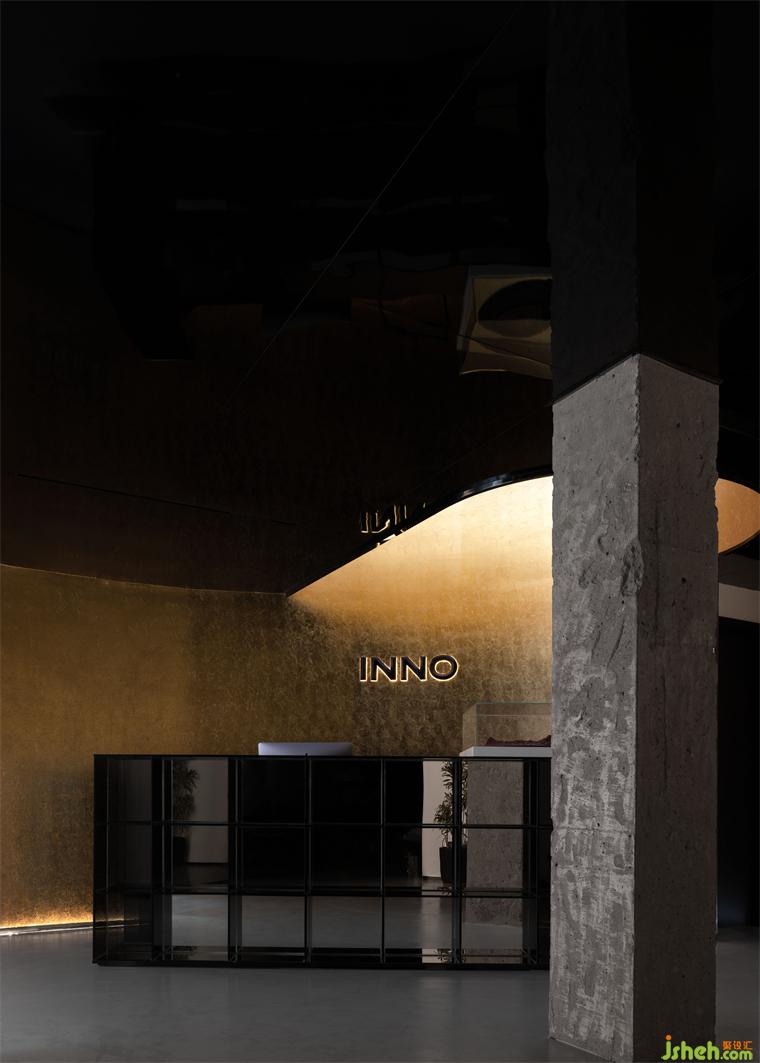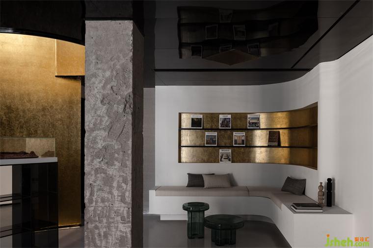 二樓的接待區(qū),是一次“無中生有”的再創(chuàng)。酒店設(shè)計(jì)封閉的墻體在切割重塑后,解放了一整片被束縛的全新空間。黑色鏡面鋪就的天花板弱化了視覺邊界,給予人因黑而淺的戲劇性的錯(cuò)覺感。