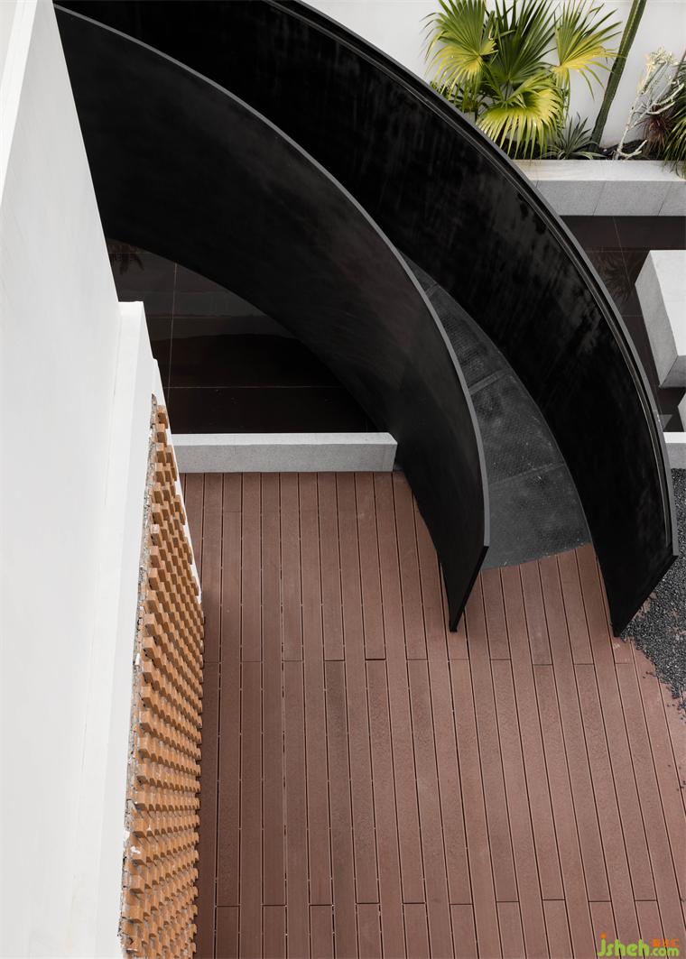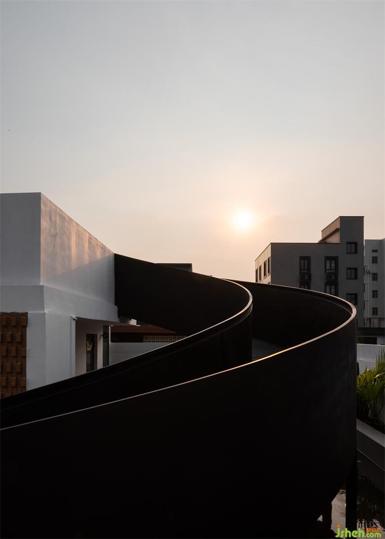 朝向陽光的奔赴是貫穿人類歷史的主題,不僅表現(xiàn)在于室內(nèi)的向外,酒店設(shè)計也同時存在于室外的向上。朝著陽光蜿蜒而上的黑色金屬梯,是陽光投射下流動的影子。它承接一種直接的溫暖,也體悟一種恒久的寓意。