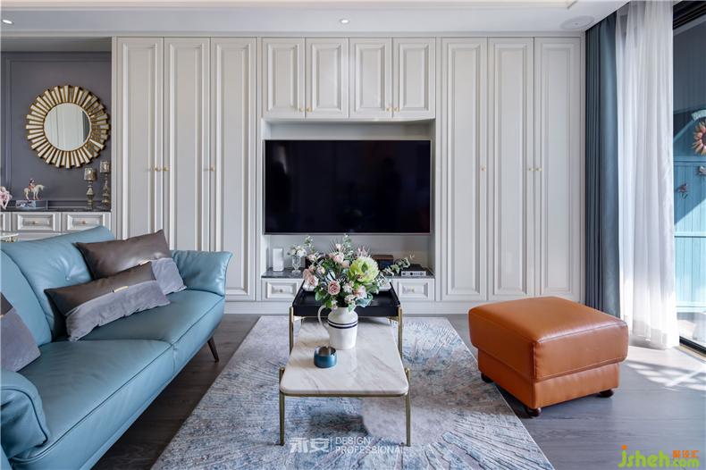 橘黃色和淺藍色的法式沙發(fā)松軟舒適,二者之間雖然色度跨度較大,但通過主題裝飾畫的映襯,室內(nèi)設(shè)計師明悅而又自然地從空間視野中跳躍出來,營造出都市生活的居家愜意