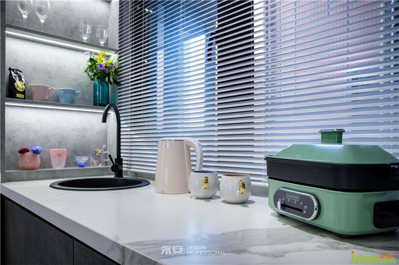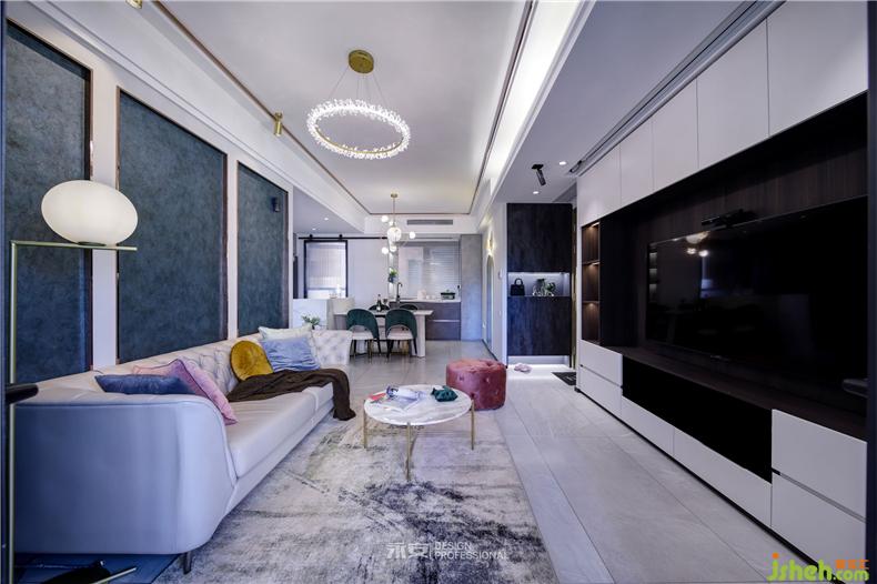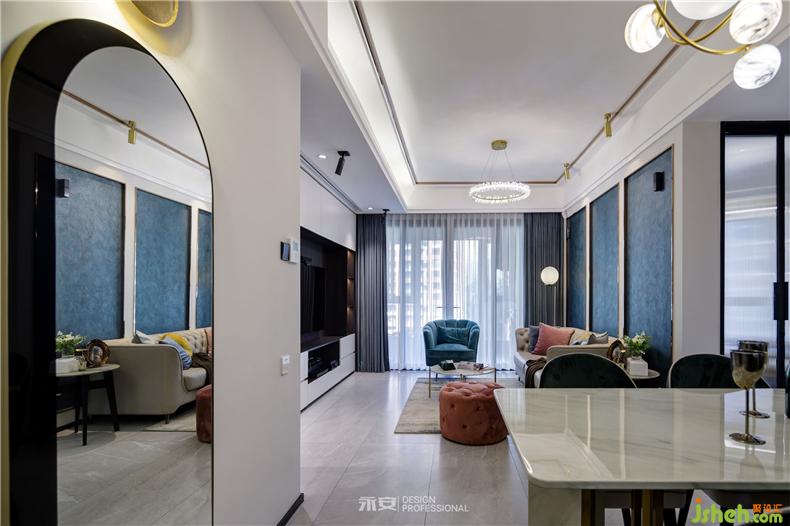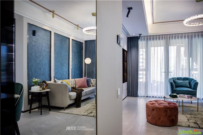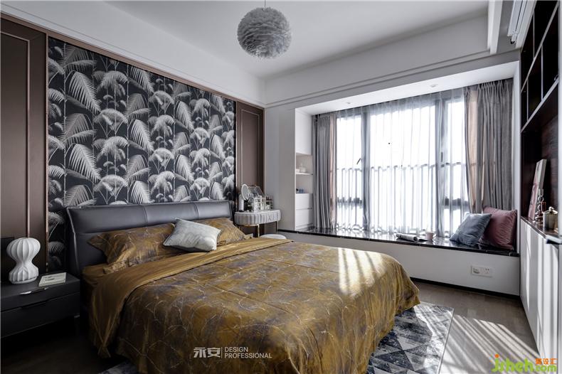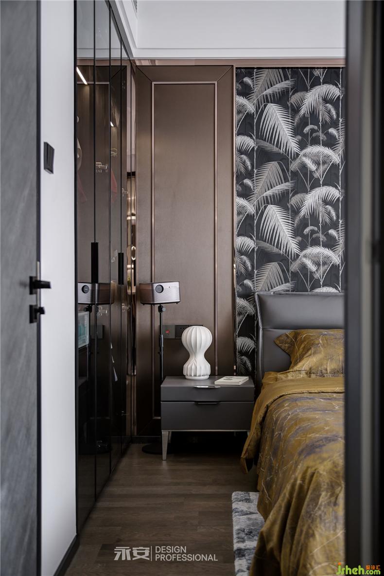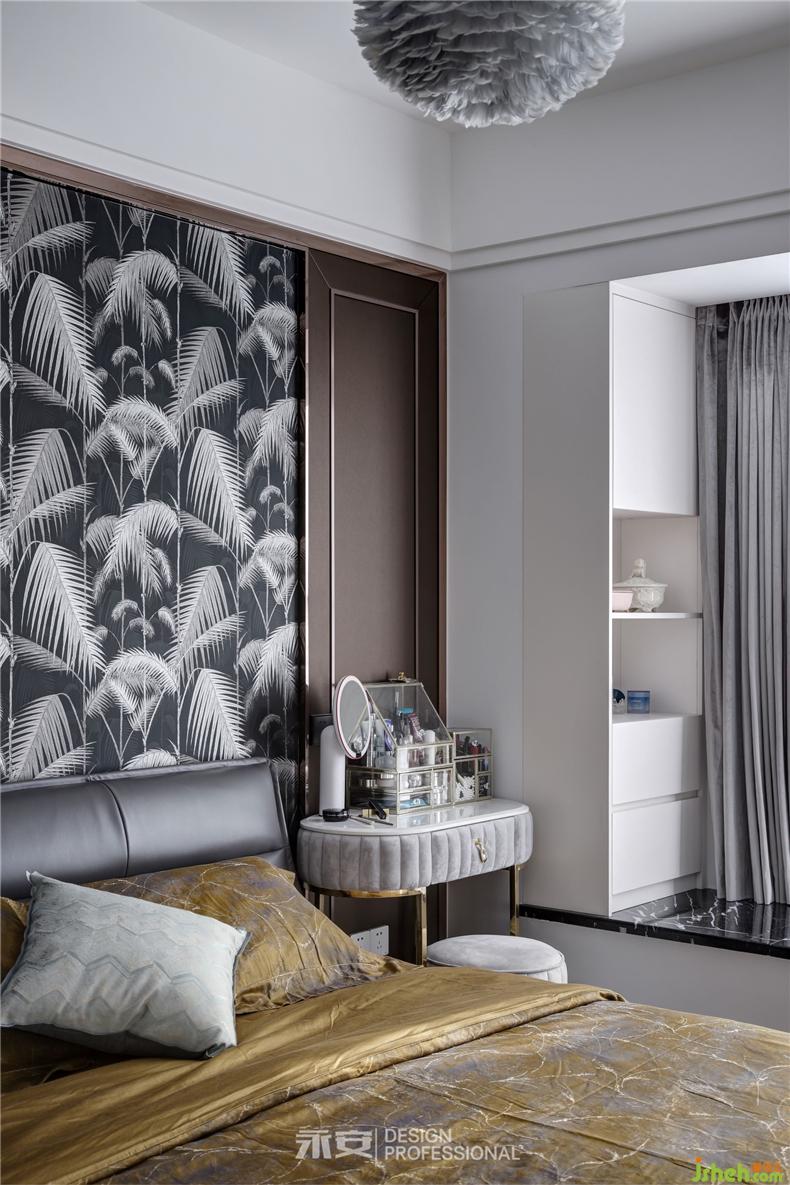 床頭是自然生趣的鳳尾竹巨幅壁畫,搭配兩邊咖啡色的飾面板,加上質(zhì)感十足的黃銅框線進(jìn)行裝點,呈現(xiàn)出一種古樸而又精致的美感。在此之下,是暗金色的被單與枕套,奢華而又舒適,善于享受生活的人自然不能在枕頭與被套上委屈自己。吊頂燈的外形猶如一團(tuán)漂浮著的羽毛,打開燈時,光線從羽毛間的縫隙中射出,整個主臥在這一縷縷光線的照耀下熠熠生輝
