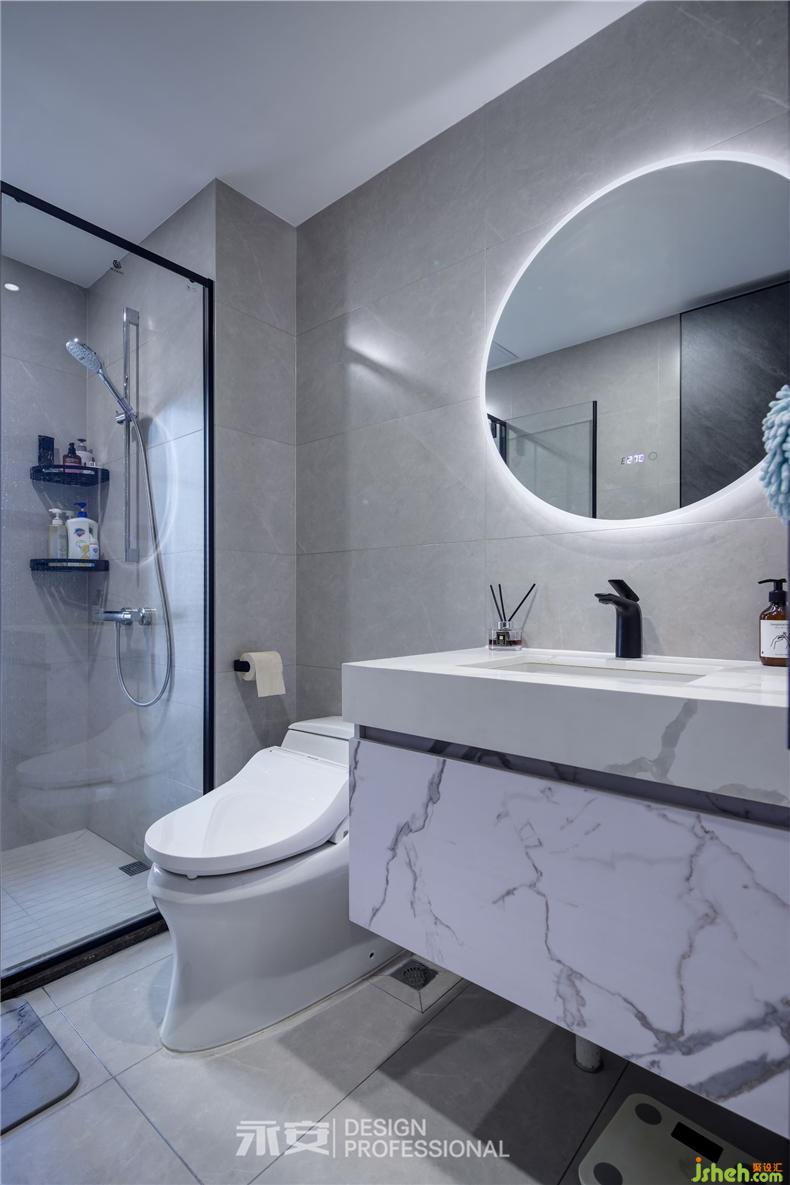 對(duì)于選材,設(shè)計(jì)師不僅苛刻,更追求材質(zhì)與空間的和諧交融。從洗漱臺(tái)到墻面、地板,都以淺色大理石為主材料,加上簡(jiǎn)潔美觀的鐵藝玻璃門,衛(wèi)生間的干凈爽朗自然而然地呈現(xiàn)出來