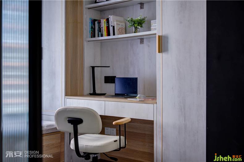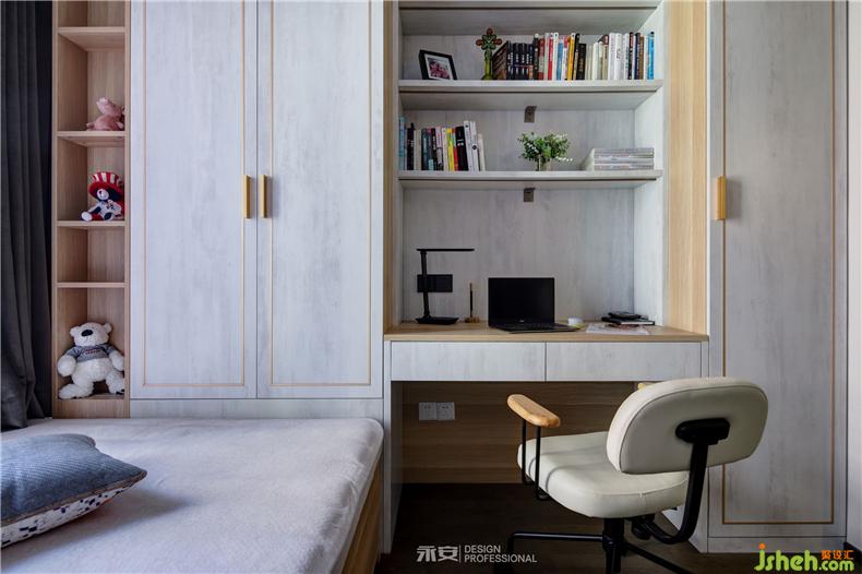 書房以白色、原木色為主色調(diào),黃銅框線裝飾的柜面,雅致中又自然地流露出主人的品味。在下午的悠閑時(shí)光里,憑窗翻卷,窗外是遠(yuǎn)方,窗內(nèi)是心靈,心目間常要一塵不染