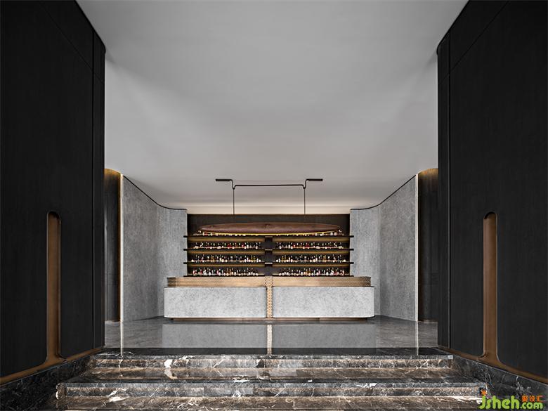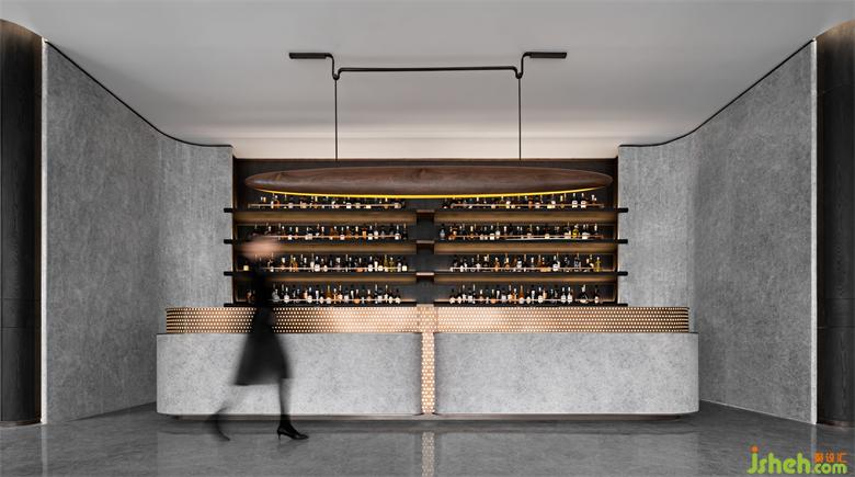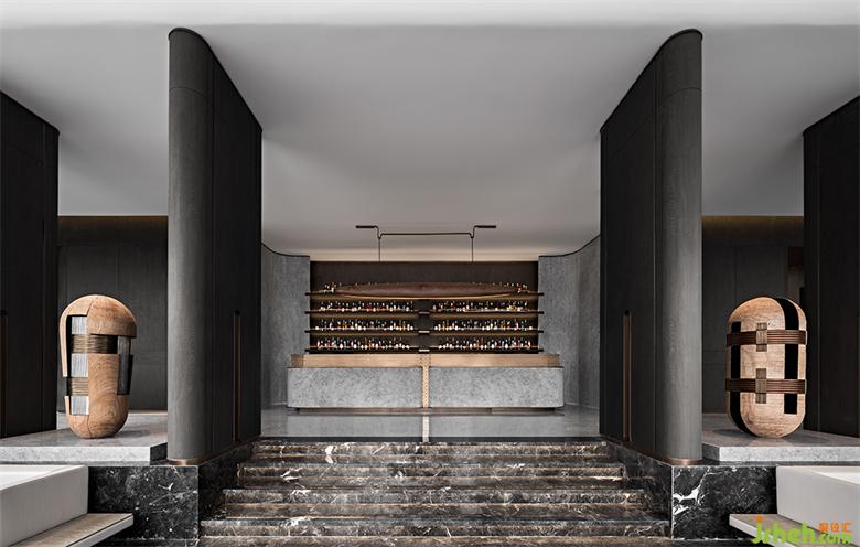 酒吧區(qū)以一葉扁舟做序,暖棕與磨砂金、亞光墨色相襯,古樸也能與奢華如此般配。