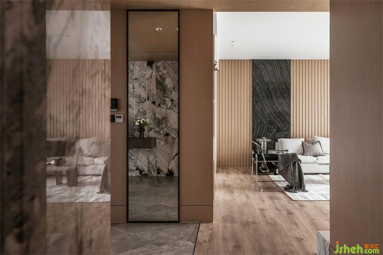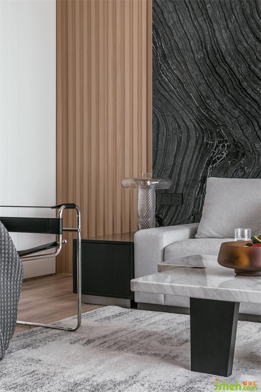 入門處運用天然加多利亞石材作背景,賦予空間藝術(shù)人文氣息。河源家居設(shè)計懸空一體柜,不同材質(zhì)色澤之間互相碰撞,巧妙地運用肌理差異性劃分區(qū)域功能。注重空間的連續(xù),入戶門前的儲物柜與對側(cè)水吧臺,提供充足儲物空間。純粹自然的材質(zhì),營造感官場域。材質(zhì)間的對話。木柵格與黑色天然石組合,線與面的交織,光影間形成虛實對比,空間架構(gòu)純粹,家具錯落有致的陳列及燈具的點綴,加深整個空間細節(jié)體驗,延伸視覺空間。