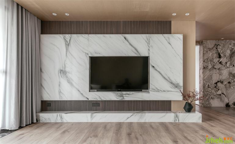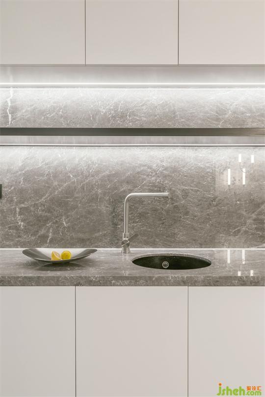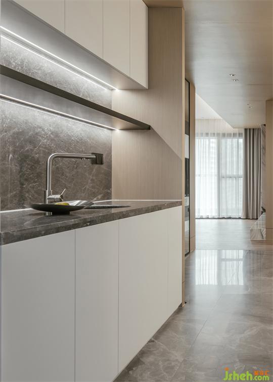細(xì)膩雅致的灰白色調(diào)。大面積的落地窗,引入自然光,使室內(nèi)明亮通透。極簡塊面結(jié)構(gòu)設(shè)計(jì),河源家居設(shè)計(jì)將橫向的木飾面穿插于縱向的灰色天然石臺面中,定制一體柜,在保證功能性的同時(shí),互通相連,創(chuàng)造出實(shí)用與美感并俱的生活場景。