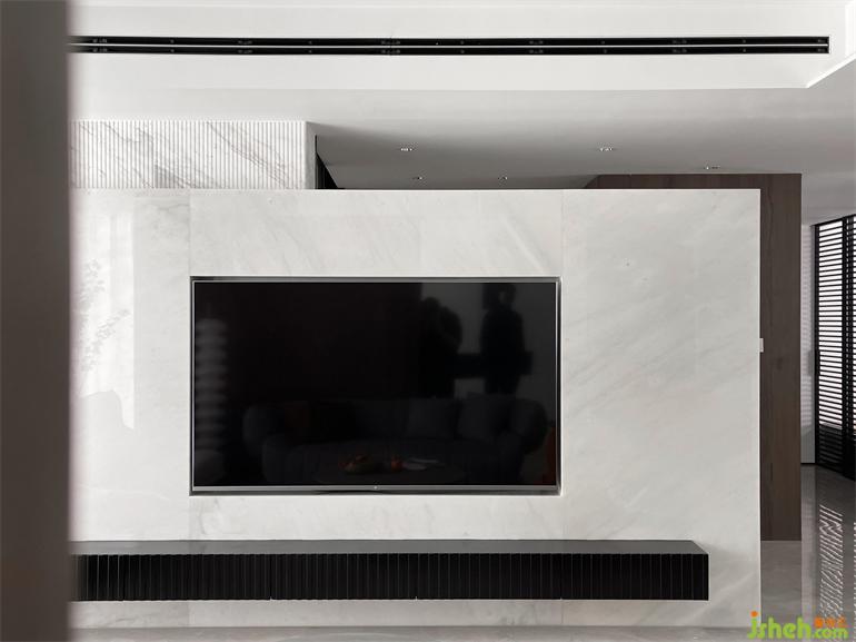 不同材質(zhì)、不同色度形成豐富的層次對比,在簡約的空間極富張力,加強(qiáng)了視覺體驗(yàn)。靈動的造型吊燈帶來頂部的光影流動,溫馨的暖光包圍整個用餐區(qū)域,給這個家?guī)砀嗟目赡苄院突痈小?