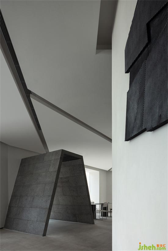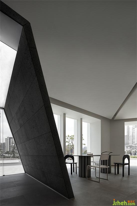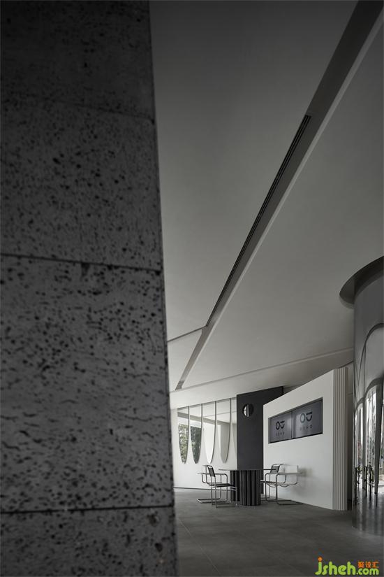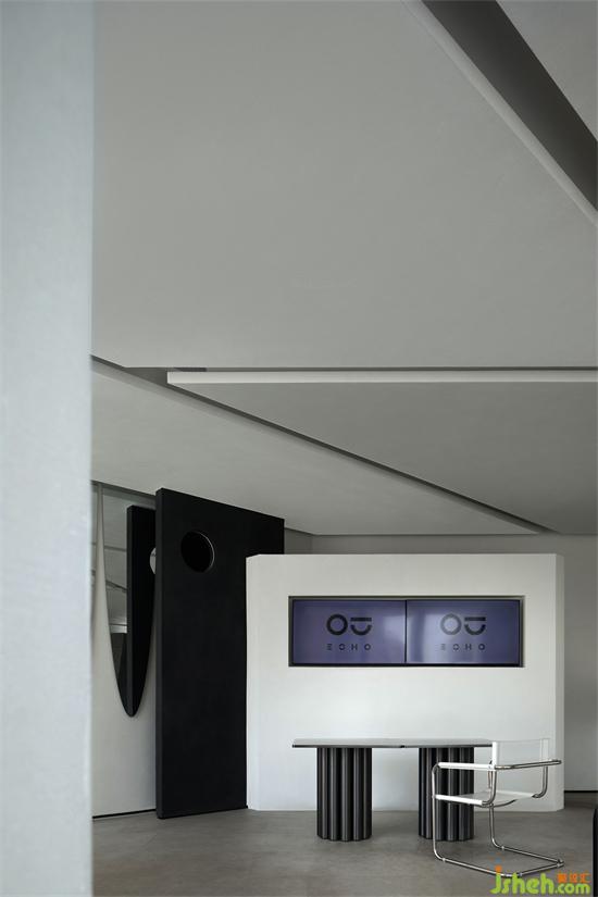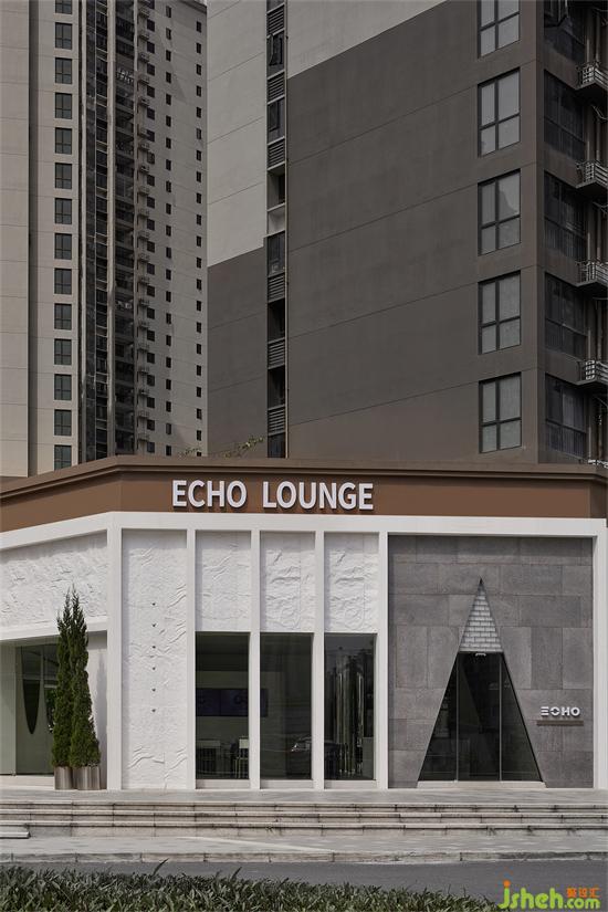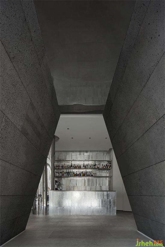 數(shù)學幾何是自然的簡約方式,也是自然的復雜邏輯。教堂設計ECHO LOUNGE獨特的幾何形入口、外立面粗糲的自然浮雕肌理和大尺度的落地窗結(jié)構(gòu),于周圍的裙樓建筑中凸顯出來。與之相對應的,色彩的深與淺、幾何的面與線,材質(zhì)的純粹性和肌理表情卻創(chuàng)造了一種戲劇性的視覺對比。