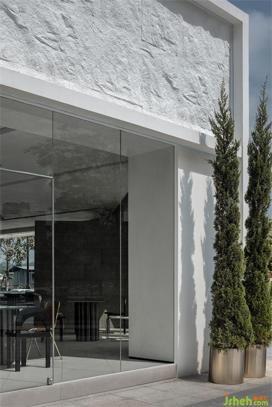 文昌路的西北向,通過轉(zhuǎn)角場地的優(yōu)勢,ECHO LOUNGE以不規(guī)則的形式開啟了一場“享受美食樂趣”的探索之旅。教堂設計約束與展示,等同于克制與開放,虛實相間的思考體現(xiàn)了與街區(qū)不同界面的處理關系,隱而實的主入口,以堅硬的火山巖表皮為主要特征,強調(diào)入口的存在;內(nèi)部就餐區(qū)的虛,則以通透玻璃為介質(zhì),便于借用所處的城市景觀。