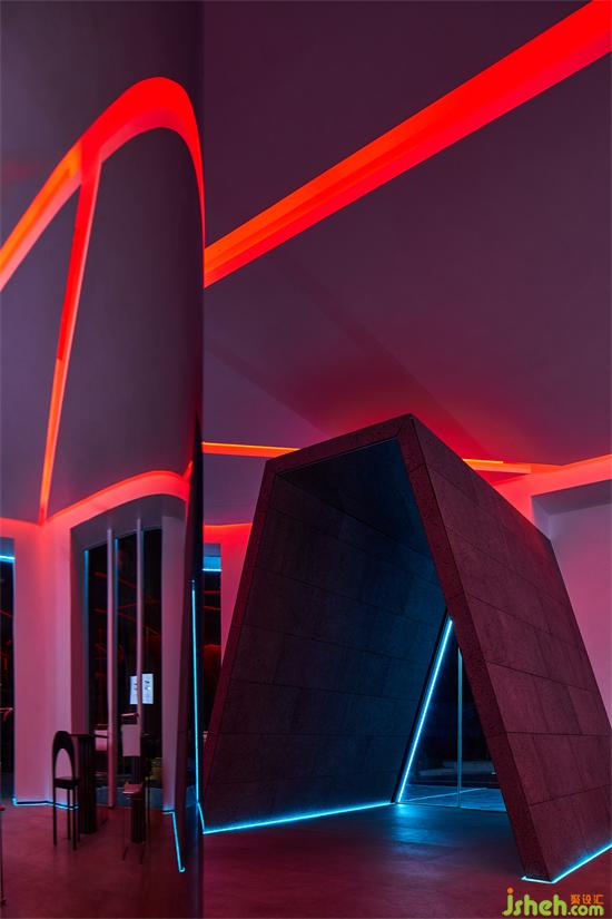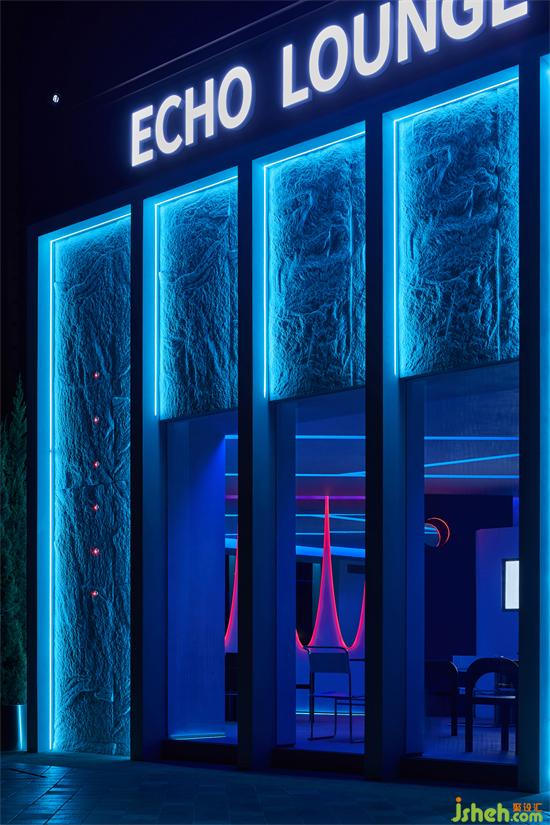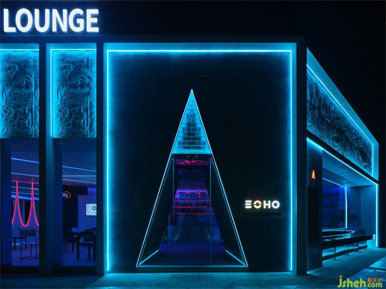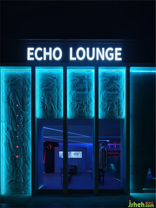 三角形作為個性鮮明的符號,向來傳達出獨特的神秘感。教堂設(shè)計方向性的幾何線條塑造出ECHO LOUNGE的主要入口,內(nèi)嵌在區(qū)別于其他立面的深色墻面之中,使整個不規(guī)則的場地單獨出現(xiàn)了穩(wěn)定的軸線結(jié)構(gòu),并形成了一定的視線遮擋,暗示著未知情節(jié)的即將發(fā)生,吸引顧客的好奇、停留,繼而步入室內(nèi),一探究竟。