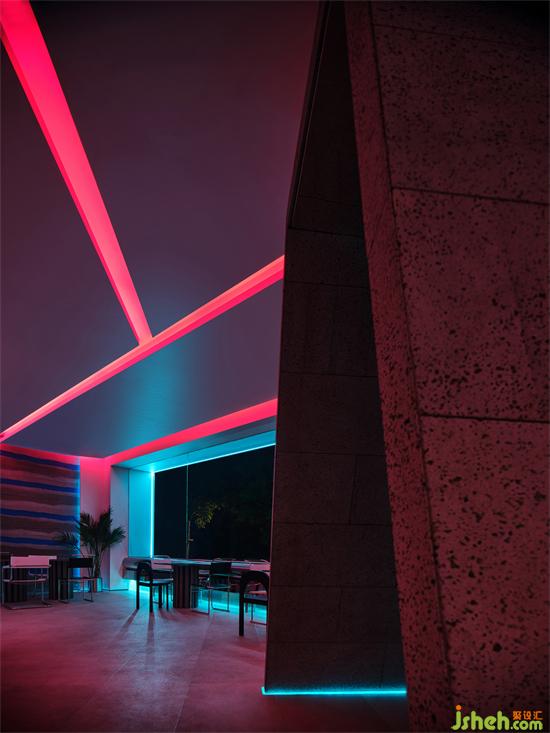 材料、形體、燈光本身所蘊含的特性和情緒的表達,被敏銳的設(shè)計所捕捉,并通過這種具象的“直覺”表現(xiàn),再造感性的空間。就餐區(qū)開闊的落地窗消解了室內(nèi)外的界限,最大限度的將光線引入室內(nèi)。教堂設(shè)計天花被幾何線條切割成不規(guī)則的形狀,以此呼應場地的不規(guī)則現(xiàn)狀,渾然一體的地面材質(zhì)進一步增強空間質(zhì)樸自然的氛圍,同時為迷離的燈光夜景提供的“空白”的背景。