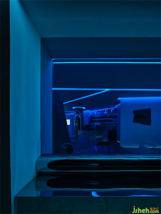 于入口處,置入一個梯形的過渡形體,創(chuàng)造出由外而內(nèi)的時光隧道之旅。教堂設(shè)計穿過玻璃門,視線被火山巖豐富細膩的肌理表情所吸引,從外部的喧鬧到達獨具特色的內(nèi)部空間,顧客的情緒也產(chǎn)生了微妙地轉(zhuǎn)換。視線端點,閃爍著金屬光澤的吧臺與地面融為一體,一側(cè)的亮面不銹鋼圓柱,映射了周圍的復雜環(huán)境,營造出后現(xiàn)代式簡約冷峻的空間情境。