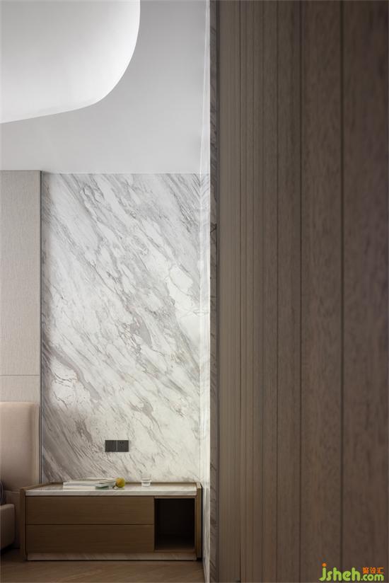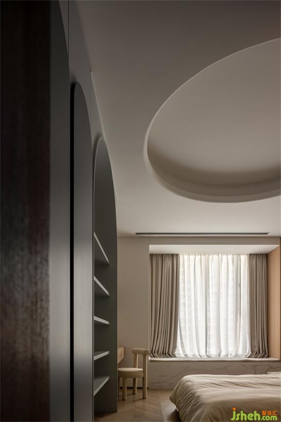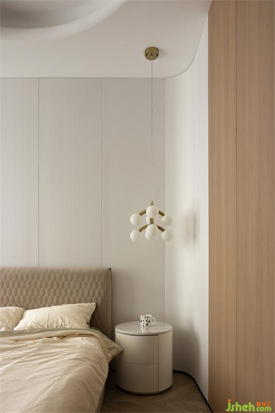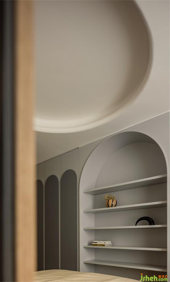 大量采用圓弧細(xì)節(jié),柜體的云朵圓形的天花造型,柔軟的布藝,象征著空間柔軟的一面。