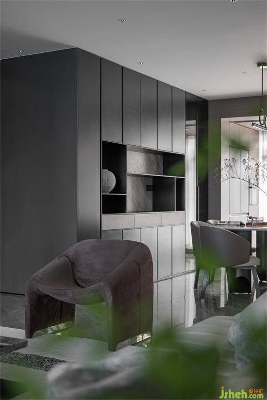 東江盛世豪宅設計將家庭生活空間場景結合以充足的儲物設計,舒適的照明,融合木飾面,玻璃柜門與不銹鋼鋼板等材質搭配,造型與功能的關系緊密聯(lián)系,突破傳統(tǒng)設計,滿足居住者所需要的實用性能與美學追求。