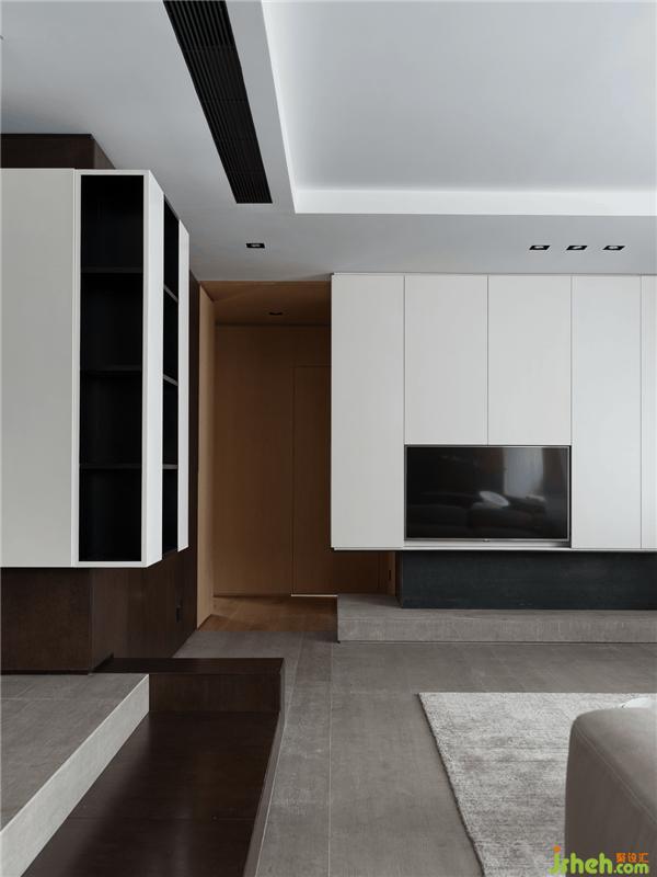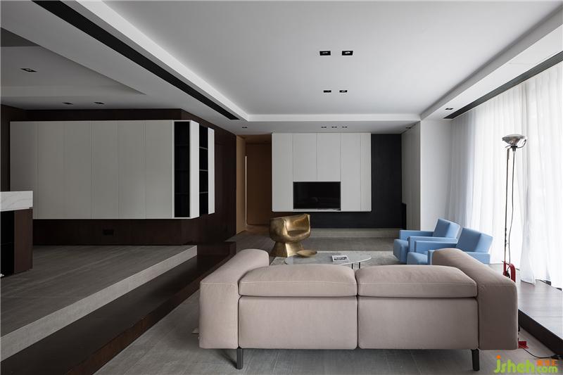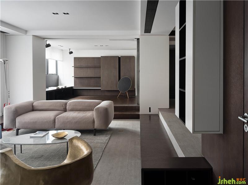 空間打破原本局促的格局,從入口處開始規(guī)劃出一條干凈利落的空間動線。以地臺高低的變化將客餐區(qū)一分為二,客廳利用四周靈活可抽動的踏板臺階為界,同時回型合式踏板塑造出空間的體塊感。