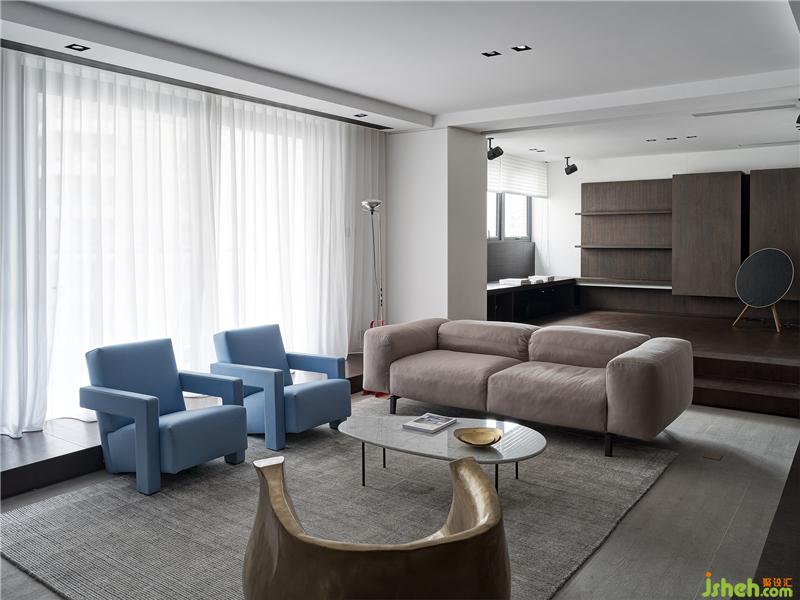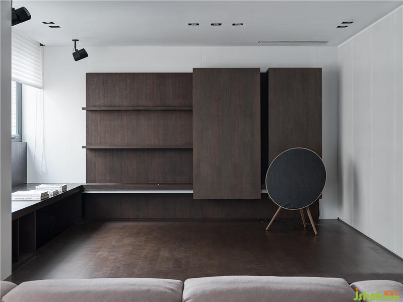 客廳后方介于公私領(lǐng)域間的多功能室,既是待客之處,也是娛樂之所。半閉合推拉門的變化,提供了或開放,或私密的空間選擇。室內(nèi)設計師