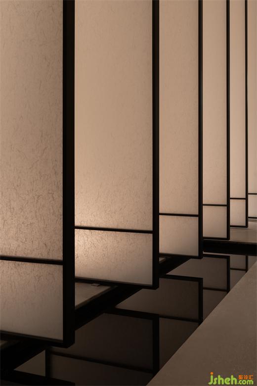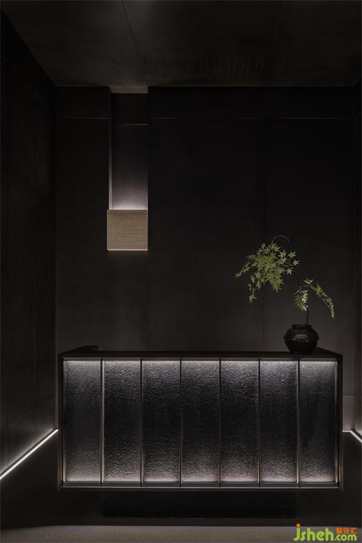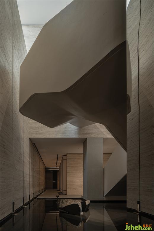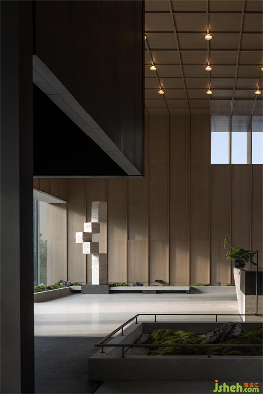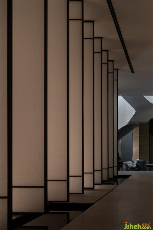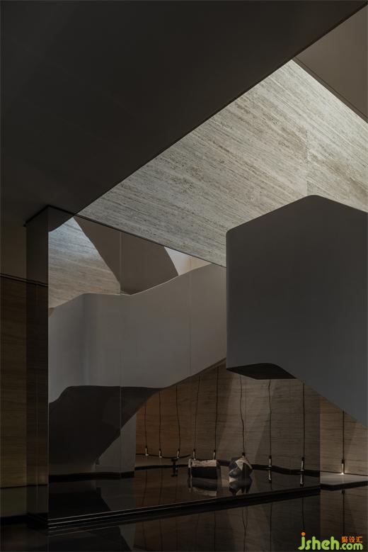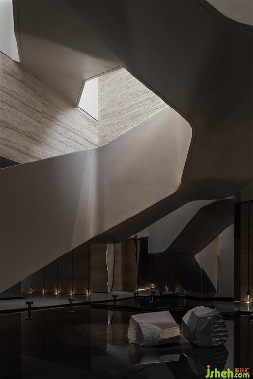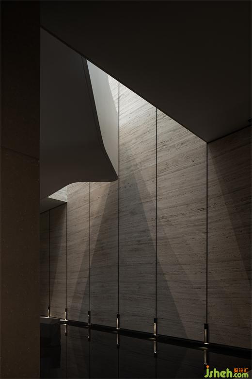 曲折迂回,幽閉與開敞之間戲劇性的轉換成為空間的主旋律。行至后場,豁然首見通透玉石,隱示空間轉入溫潤高雅之境。空間的轉折變幻,營造出人、空間、環(huán)境之間的互動關系。幽暗之處,令人專注;而開敞之時,又使人心境豁然開朗,相互襯托,形成對比與和諧的統(tǒng)一。