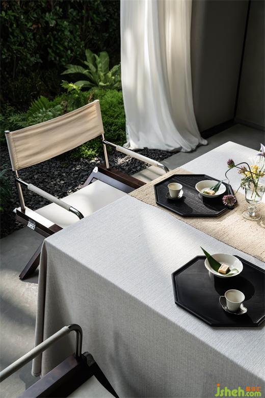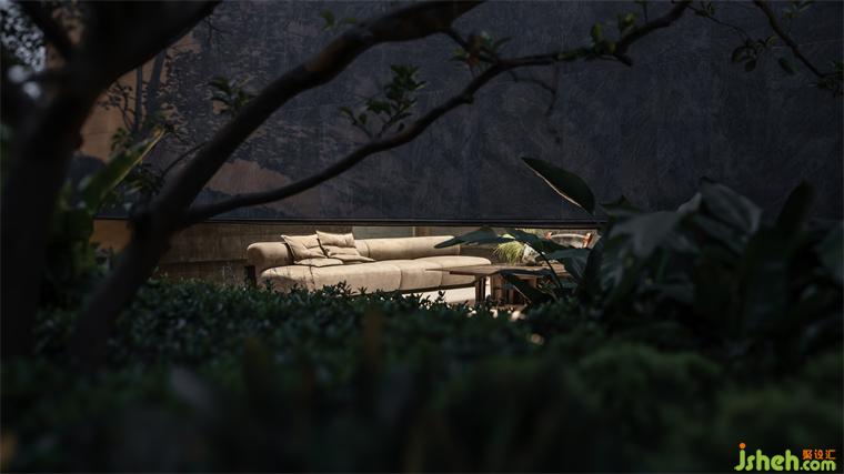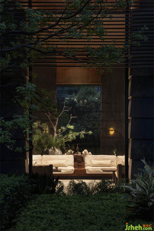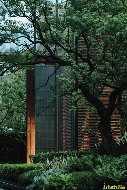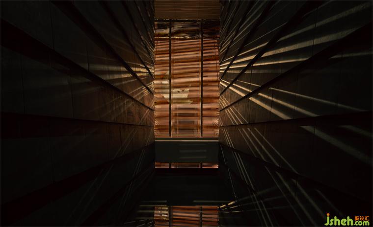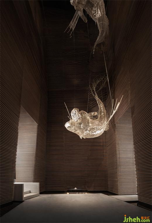 “竹”被解構(gòu)再重組,自下而上傾斜生長(zhǎng),售樓處設(shè)計(jì)將竹子柔韌的流動(dòng)狀態(tài),轉(zhuǎn)譯為現(xiàn)代的序列感,成為東方文化中堅(jiān)韌不拔、節(jié)節(jié)向上的精神隱喻。光透竹隙,時(shí)移景遷,虛實(shí)間光影變幻。伴隨涌泉裝置的水聲,視覺(jué)、聽(tīng)覺(jué)、觸覺(jué)、嗅覺(jué)交織于此,帶來(lái)多維的感官體驗(yàn),入口處的藝術(shù)轉(zhuǎn)換廳因此展現(xiàn)強(qiáng)烈的場(chǎng)地感知。