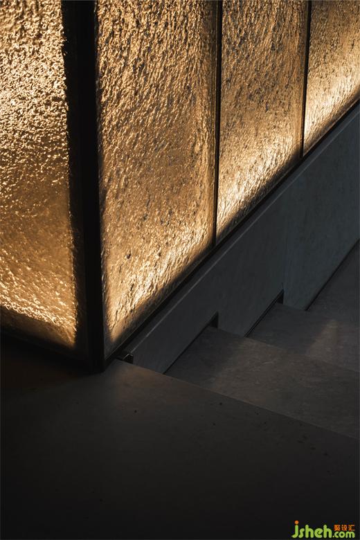 層次分明的高差變換,步移景異的水景汀步,共同營(yíng)造山間游走的雅趣。藝術(shù)玻璃以節(jié)奏感將原始結(jié)構(gòu)柱包裹,陽(yáng)光下展現(xiàn)色彩流轉(zhuǎn),虛實(shí)間的交替與節(jié)奏變化,使場(chǎng)地呈現(xiàn)開(kāi)放流動(dòng)的特質(zhì),引人沉浸于探索的趣味中。