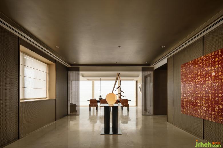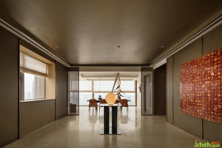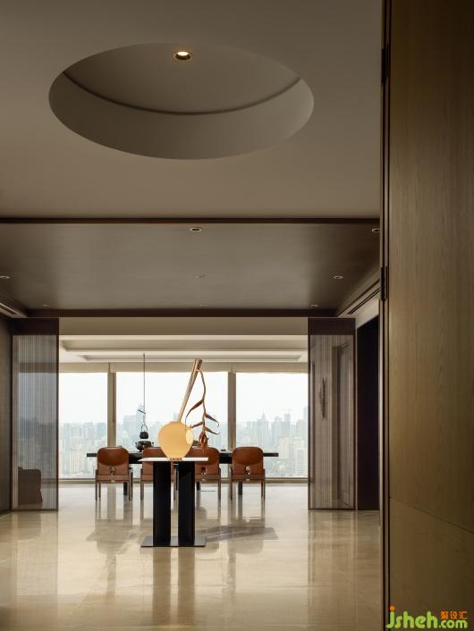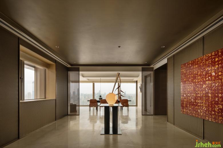 面朝長(zhǎng)江,彼岸建筑光影閃爍,總能讓時(shí)間不知覺地延長(zhǎng)。生活的從容在杯盞間流轉(zhuǎn),餐桌上的紅色大漆盤子與金色餐盤,武漢樣板間設(shè)計(jì)以卷軸為靈感的吊燈,透過當(dāng)代設(shè)計(jì)語(yǔ)言,不斷賦予空間摩登與復(fù)古的氣質(zhì)。此情此景,描摹出了居住日常的詩(shī)意。