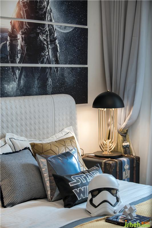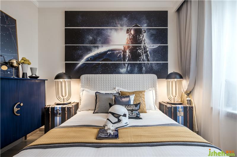 父母房通過黛藍和米咖色營造出雅致溫和的空間氛圍,抽象寫意的裝飾掛畫,即營造出歲月靜好的幸福生活,又為雅致的空間氛圍增添一些隨性的趣味。