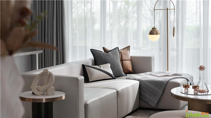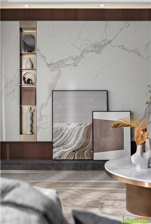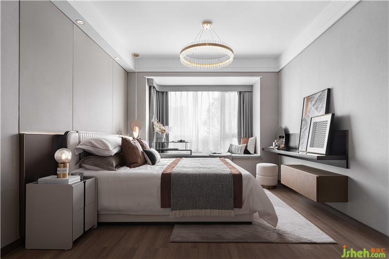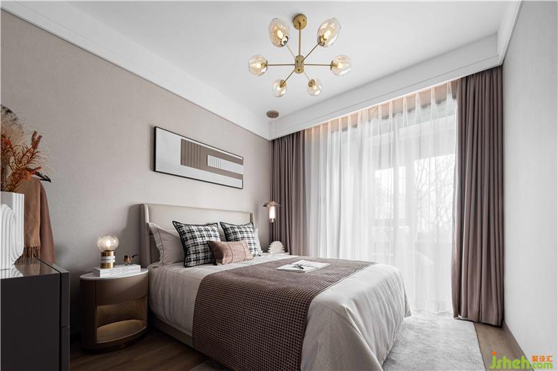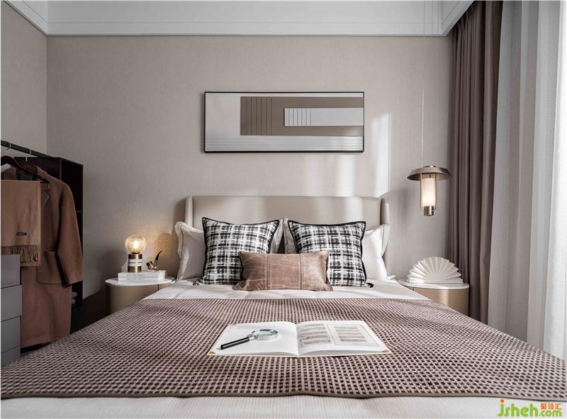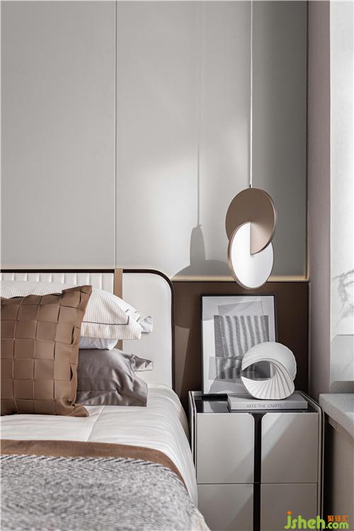 高雅溫厚主臥注重打造舒適、品質感,帶來豐富的視覺享受。流暢的布局和舒適的尺度,精選皮革,精裁成細條,層次堆積的藝術掛件,鄭州樣板房設計包容精致的生活態(tài)度與生活的鮮活烙印。