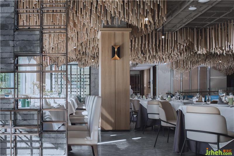 二樓延續(xù)一樓的主色調(diào),整體空間靜謐而舒適,一側(cè)靠窗的位置充分保證室內(nèi)的光線,便隨著天花藝術(shù)裝置灑落而下。The main color tone extends to the second floor, maintaining the serenity of the dining hall. The window-side seats provide ample light for the hall, which shines down from the ceiling.
