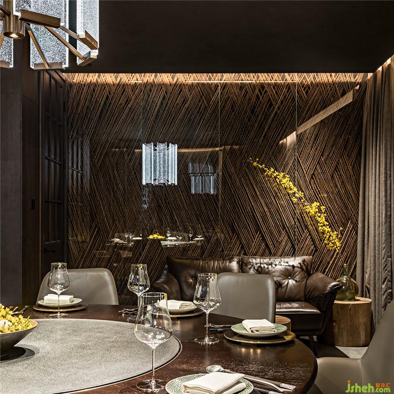 包間內(nèi),材質(zhì)再次演繹,原始肌理進(jìn)一步退后,隱藏在儀式感更強(qiáng)烈的結(jié)構(gòu)和家具之下,一點(diǎn)點(diǎn)距離感的營(yíng)造讓室內(nèi)的調(diào)子趨于沉穩(wěn),將包間成熟厚重的體驗(yàn)感推向極致。