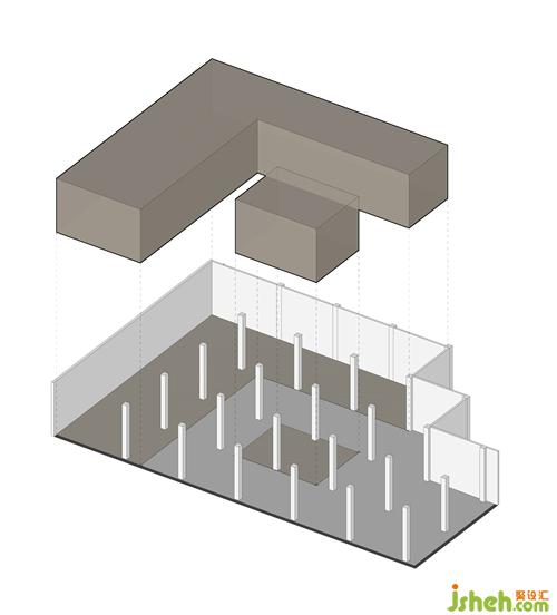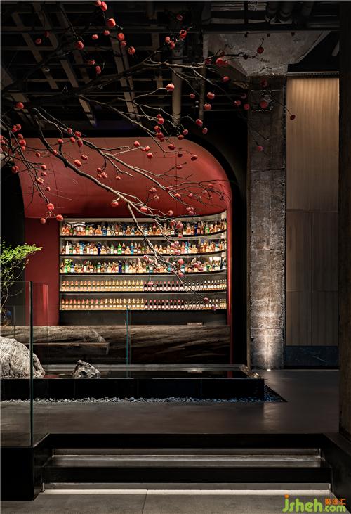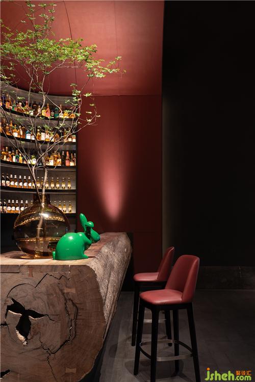 紅色吧臺區(qū)構建出另外一個場景——5.2米高的紅色立面向上延伸、彎曲成弧形頂面與建筑結構相接形成灰色水泥盒子中一個嵌套的模塊,古老京城似乎正從這一隅慢慢醒來,被注入鮮活涌動的生命力。