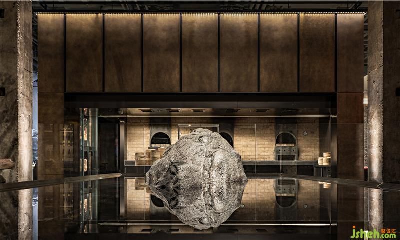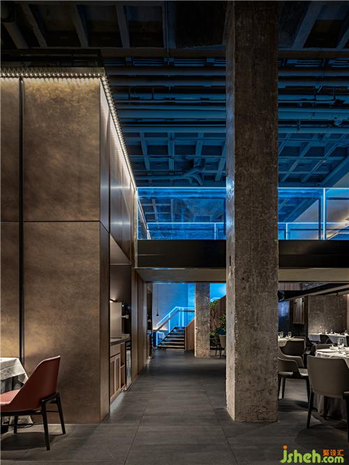 進入晚餐時段,大面積渲染的藍色燈光從天花及部分墻面“溢出”,如同數(shù)字化的夜晚天光。當代設計手法、傳統(tǒng)地域文化與舊建筑符號交匯成動態(tài)的時間線,和進入空間的每個人發(fā)生交互。