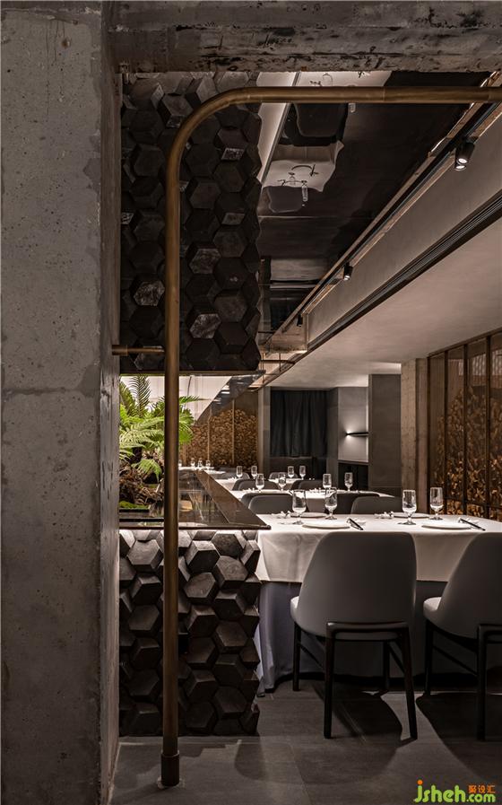 在無限質(zhì)樸,貼近自然的底色上,以藝術(shù)手法、材料、燈光“施金措彩”是讓整個(gè)餐廳空間獨(dú)樹一幟的巧妙手法。