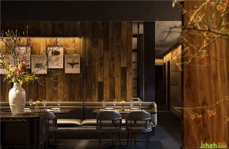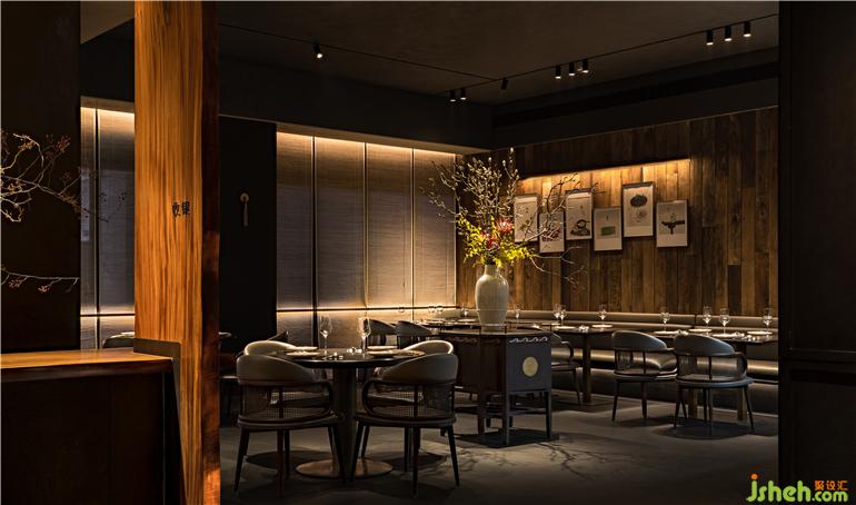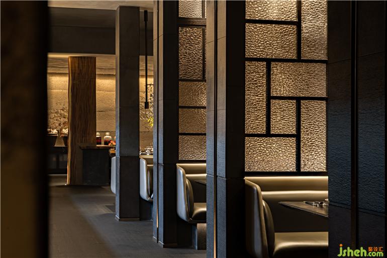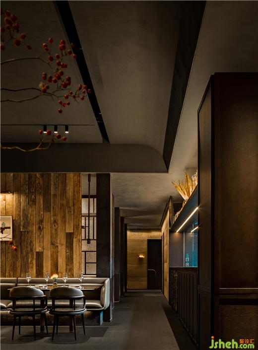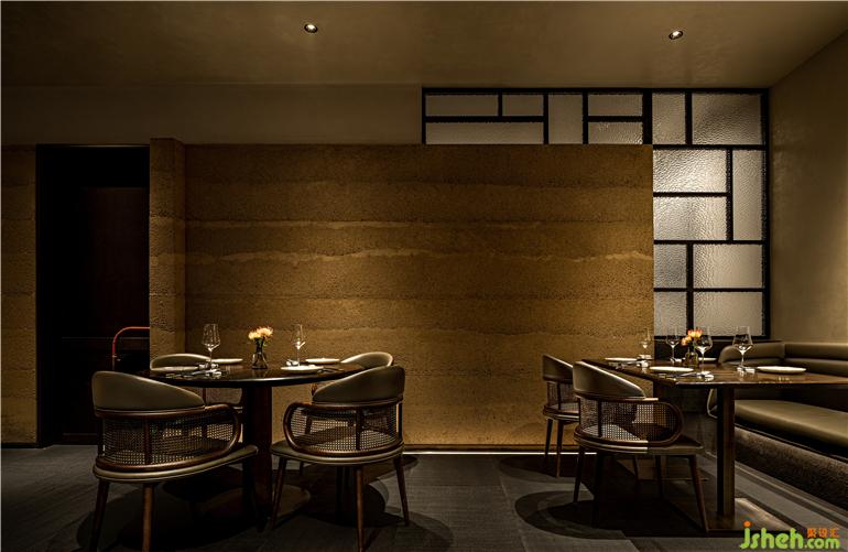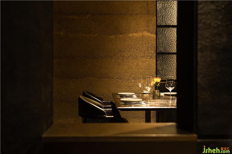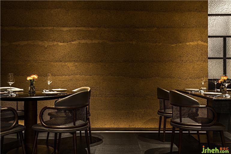 室內(nèi)燈光氛圍溫煦,起承轉(zhuǎn)合、疏密有致,老榆木和夯土在立面大量使用,前里臺州魚市餐廳設(shè)計使空間整體氛圍質(zhì)樸而富有溫度,夯土的自然肌理使其在燈光下猶如金箔帷幕,與傳統(tǒng)黛色地面呼應(yīng)形成內(nèi)斂厚重的底色,這種由原始材料帶來的精致現(xiàn)代感歸功于設(shè)計的整體把控,以及權(quán)衡材料比重和燈光渲染的綜合結(jié)果。