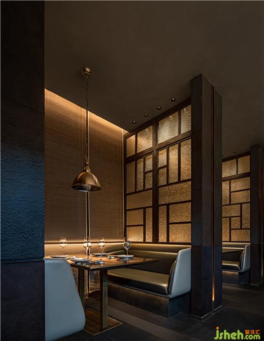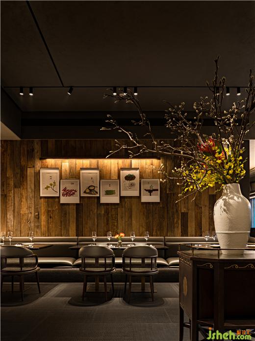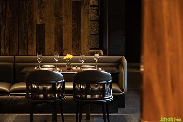 餐廳家具的選擇在形態(tài)和材質(zhì)上盡可能結(jié)合了傳統(tǒng)設(shè)計和現(xiàn)代材料,前里臺州魚市餐廳設(shè)計以確保舒適度和風(fēng)格匹配,深灰色皮革大量使用與傳統(tǒng)木材質(zhì)結(jié)合,帶商務(wù)感和家庭感的平衡。