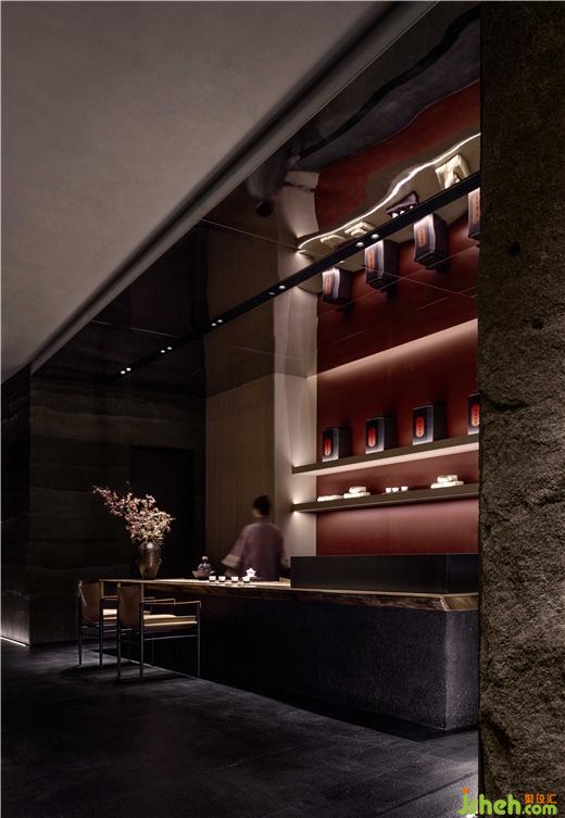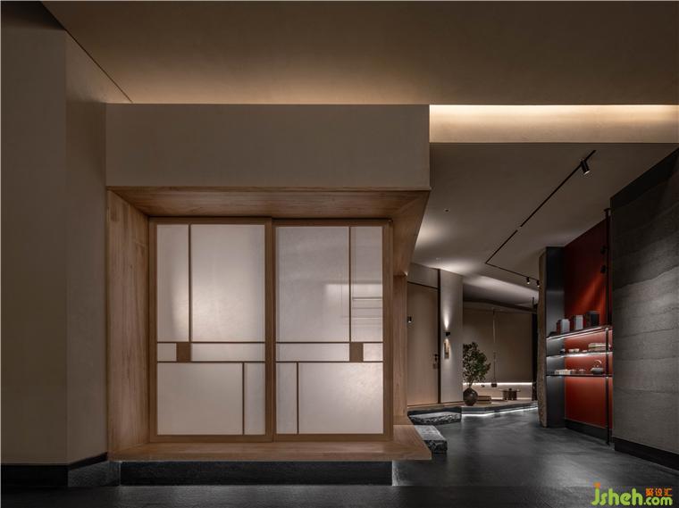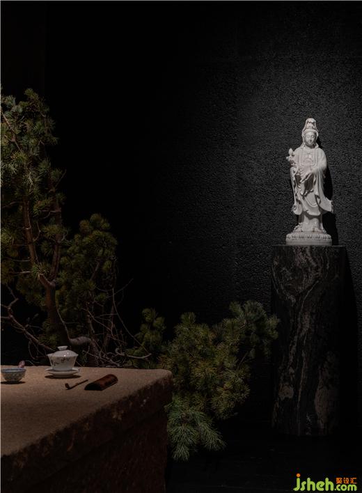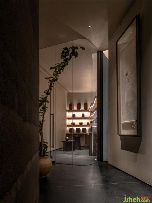 自入口起,整塊山石劈鑿掛墻,將城市推入山林。茶樓裝修設(shè)計(jì)由此進(jìn)入,夯土、木飾板、深色肌理漆將空間收至靜謐幽深,茶吧與轉(zhuǎn)角火塘茶道區(qū)自空間浮出。回廊向內(nèi),古樸山石踏步,茶室設(shè)計(jì)略高于地面,如林間茶寮浮于草木山石上。接下來(lái),松竹、屏風(fēng)、卷軸、瓶插、琴、石、茶器逐一呈現(xiàn),對(duì)器物更細(xì)化的講究從《長(zhǎng)物志》中便有體現(xiàn),從實(shí)用出發(fā),不渉粗浮之氣。