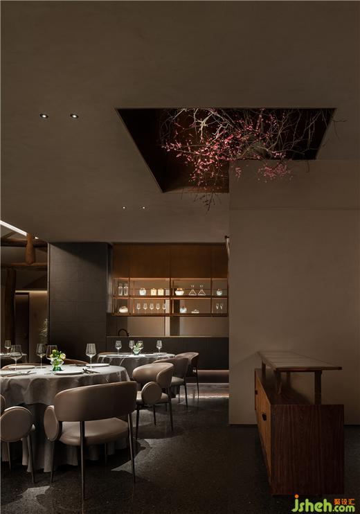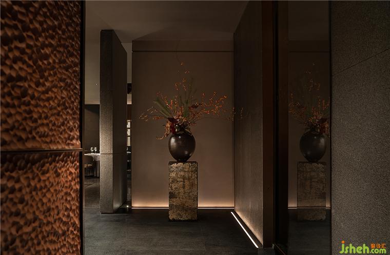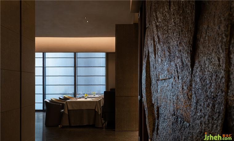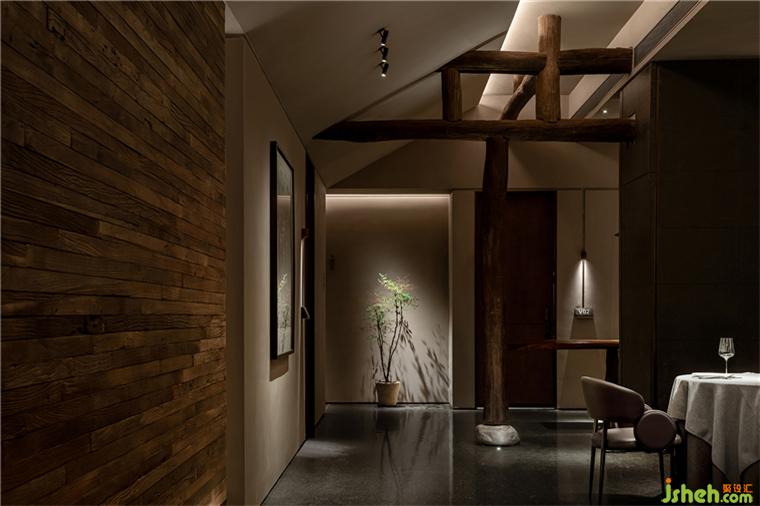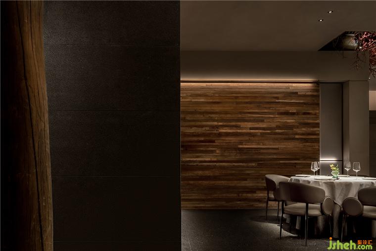 劈鑿厚重的山石立面和紋路深刻的老木板粗獷地勾勒了臺(tái)州開(kāi)闊的山海精神;禾苑餐廳設(shè)計(jì)混合著蝕刻黃銅、斑駁灰磚、大理石、舊木板的空間將古老的江南民居疊映在上海之上;石墩木柱曾撐起沿革千百年的古老建筑,在新城市發(fā)展的風(fēng)云際會(huì)中漸漸隱入歷史的煙塵,在簡(jiǎn)潔素然的現(xiàn)代底色前驚鴻一現(xiàn);城市華燈初上,東方和西方在同一底色中彼此相容。
