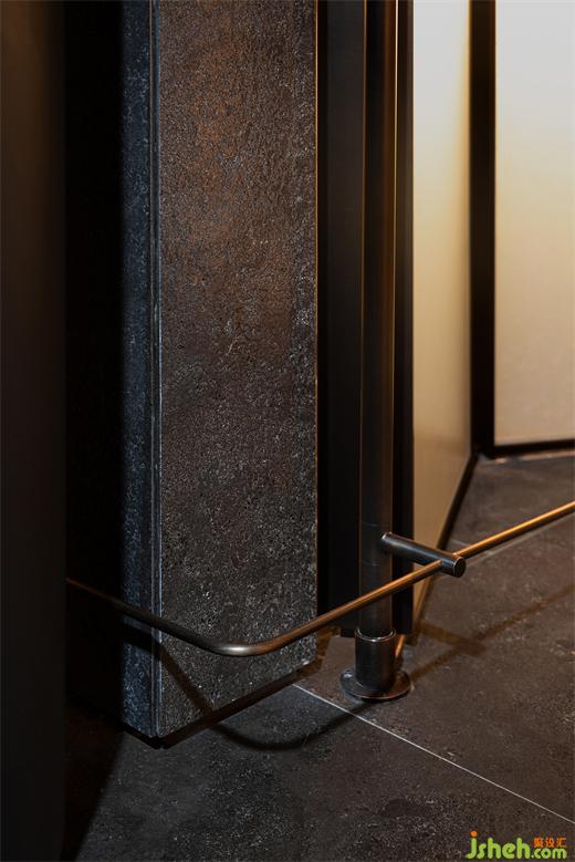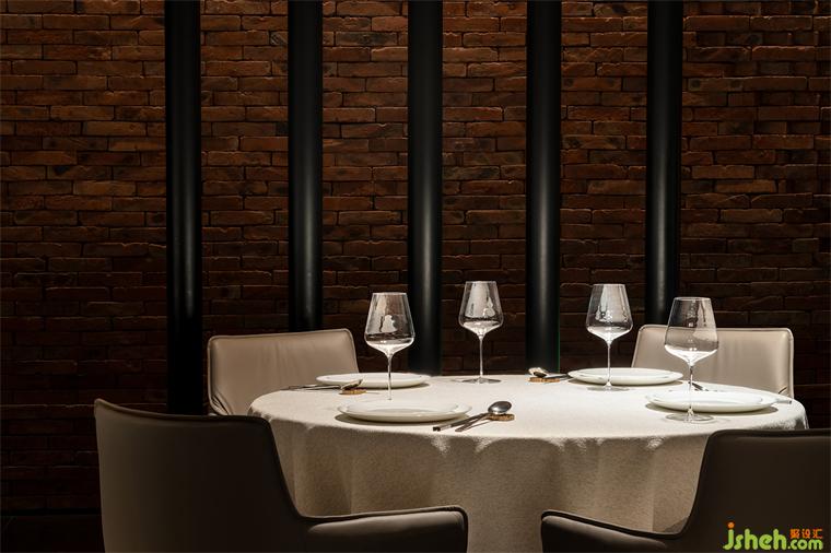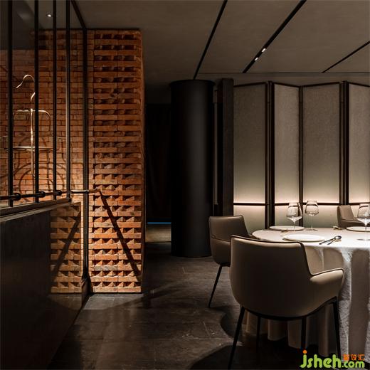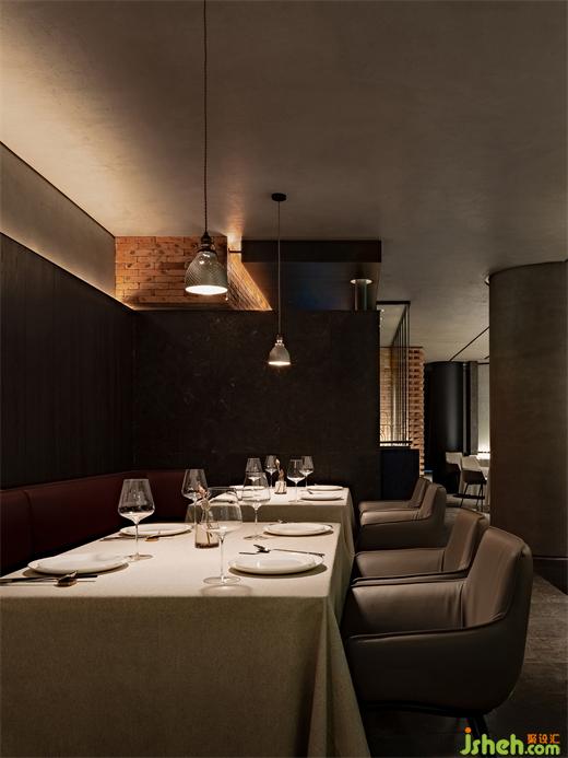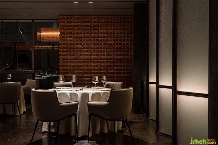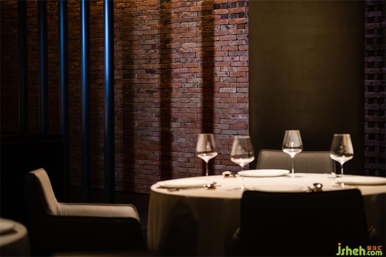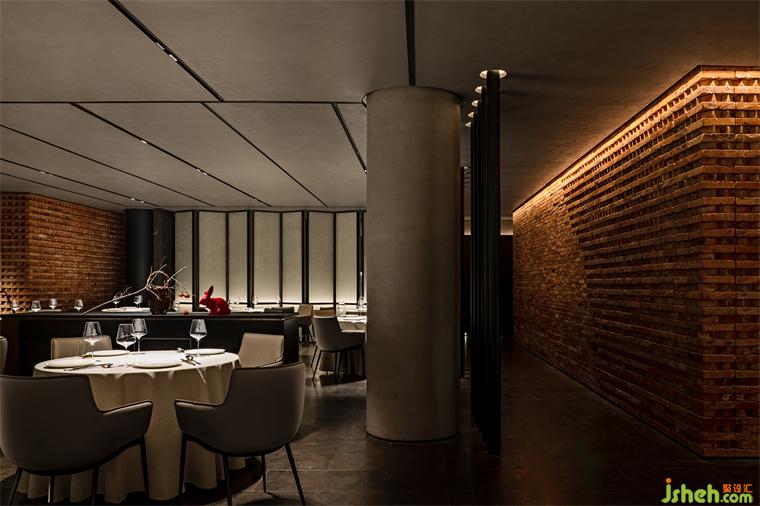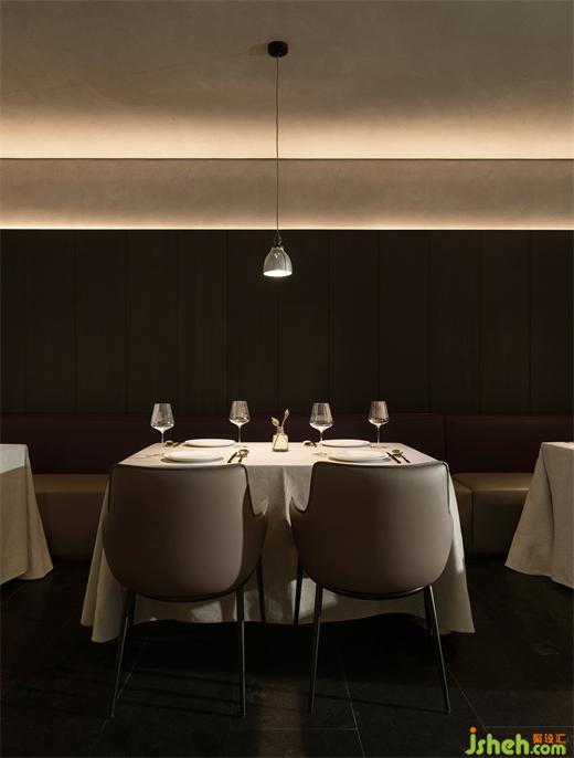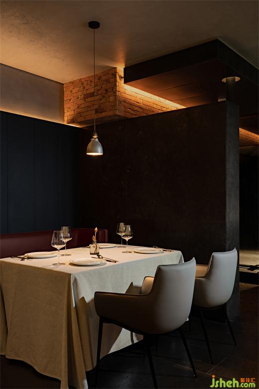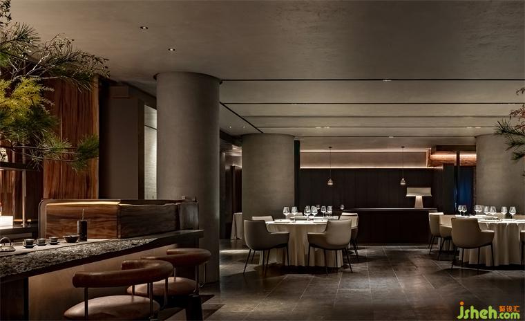 像放映一卷珍藏已久的時間底片,空間沉入一塊深沉典雅的布景中,從進(jìn)入的一刻便重置了人們之前的空間體驗。餐廳設(shè)計在灰色基調(diào)中,天花使用了較淺的灰和大地色,燈光如月光漏下,表面肌理細(xì)節(jié)在柔和的光影下無盡變化,這一設(shè)計彌補(bǔ)了地下空間無自然光照的劣勢,并巧妙地借暗調(diào)營造令人舒緩沉浸的氛圍。