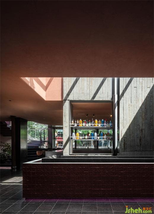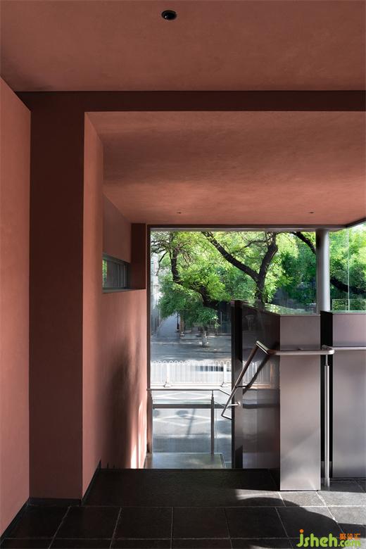 烤魚餐廳設(shè)計(jì)用鋼筋和玻璃做建筑骨架勾勒出橫豎兩個(gè)半開放的盒子,透過玻璃能看到簡(jiǎn)潔的扶梯組織起建筑動(dòng)線并從內(nèi)部連通兩個(gè)空間,同時(shí)將食客引向?qū)挸ǖ奈蓓斅杜_(tái)——簋街街景在那里盡收眼底。