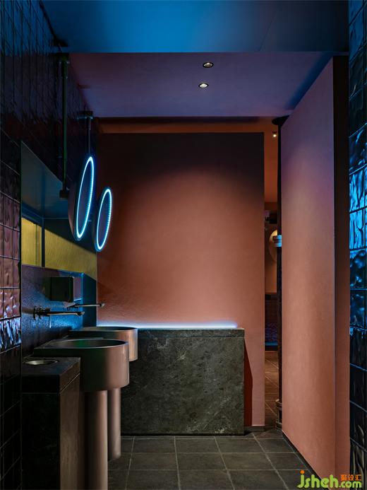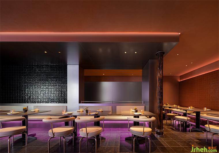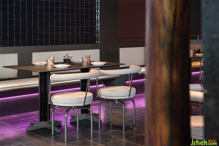 烤魚餐廳設(shè)計(jì)師運(yùn)用大膽色彩和冷峻的金屬材料將空間籠罩在一種復(fù)古未來的光彩中。氛圍的達(dá)成一部分來源于未來主義,另一部分則是機(jī)械所代表的現(xiàn)代主義,設(shè)計(jì)從近一個(gè)世紀(jì)的美學(xué)語言中尋找線索,同時(shí)也掙脫了具體的風(fēng)格范式。將毫不拖泥帶水的潔凈和抽象賦予金屬構(gòu)件,結(jié)合古典奇幻的燈光,復(fù)古機(jī)械感滑向未來宇宙,自由松弛的晚餐時(shí)段是一場視覺和味覺的共同“致幻”。