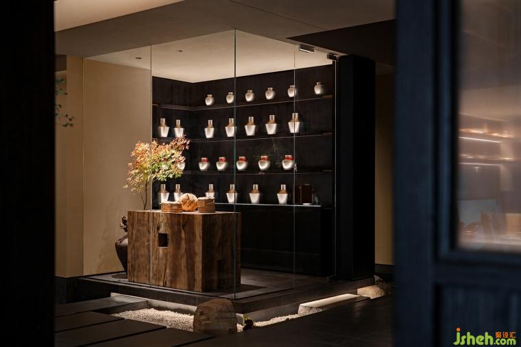 茶室設(shè)計(jì)質(zhì)性天然的磚、木、石鋪陳底色,當(dāng)代感強(qiáng)烈的弧面天花片段式地插入,與少量玻璃、金屬等材料呼應(yīng)調(diào)和古樸的氛圍。