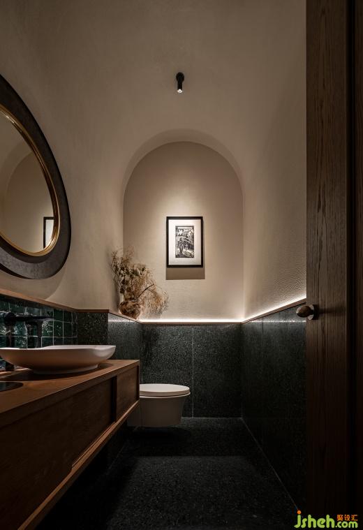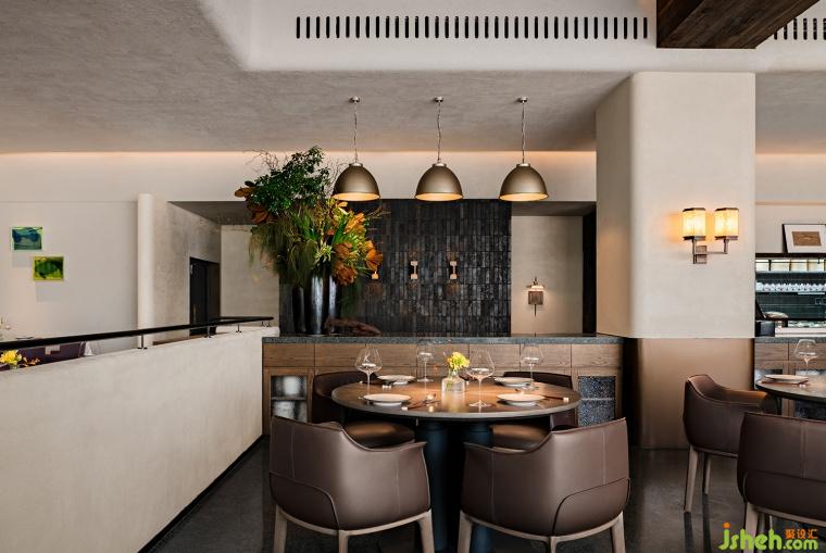 經(jīng)酒柜、吧臺(tái)、冰檔與明檔,散座區(qū)豁然開朗,自然光與內(nèi)部更適合就餐的燈光彼此作用帶來了躍動(dòng)變幻的光影,老榆木包覆的天花與立面和現(xiàn)代肌理穿插共構(gòu)。建筑、風(fēng)味、故事在此刻的相遇中激蕩起情緒的海浪。