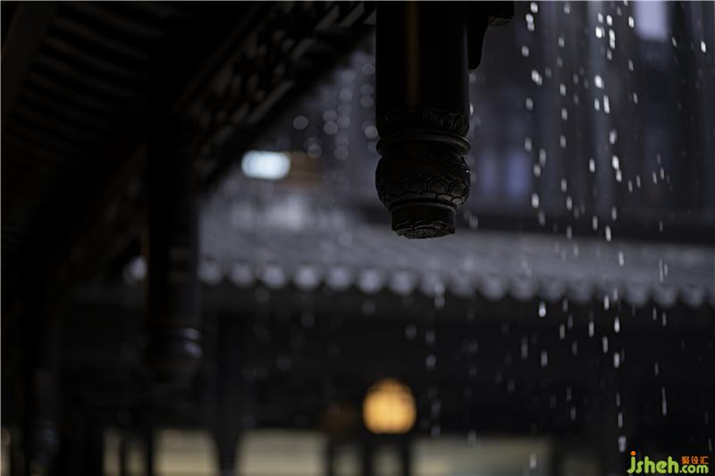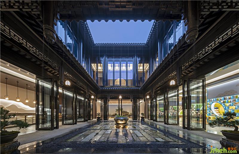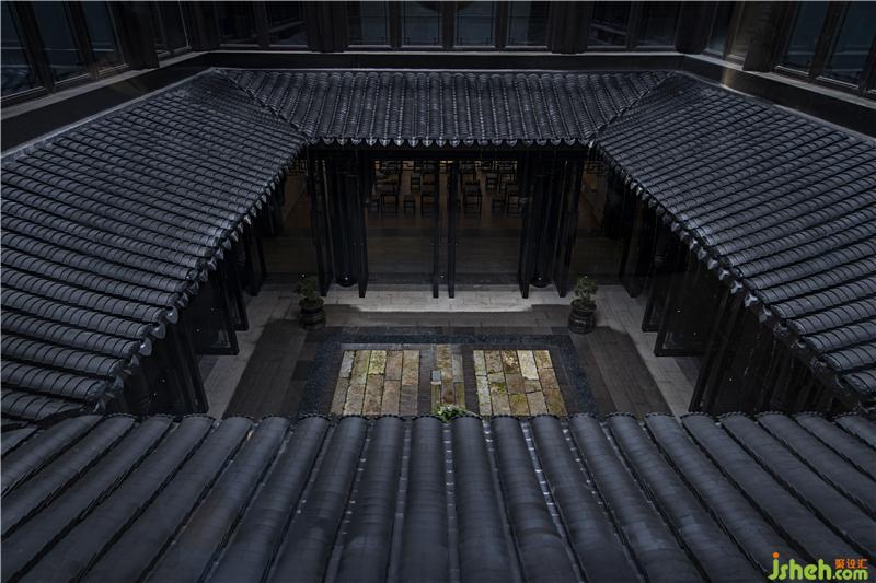 建筑的屋檐四面圍合,承載著中國(guó)傳統(tǒng)文化中“天人合一”的儒禮思想。天井之下四檐之上,歸水層層跌落聚于庭中,天、地、人通融相契,意蘊(yùn)無(wú)窮。庭院消解了建筑與天地的界限,啟發(fā)受眾曉悟建筑之外的無(wú)限富饒。